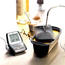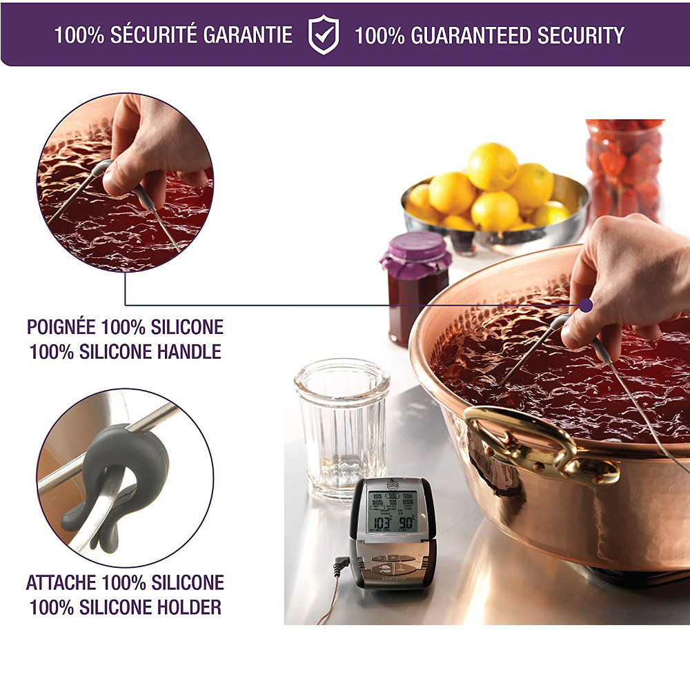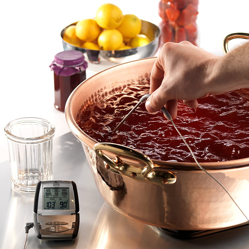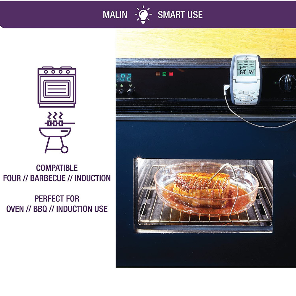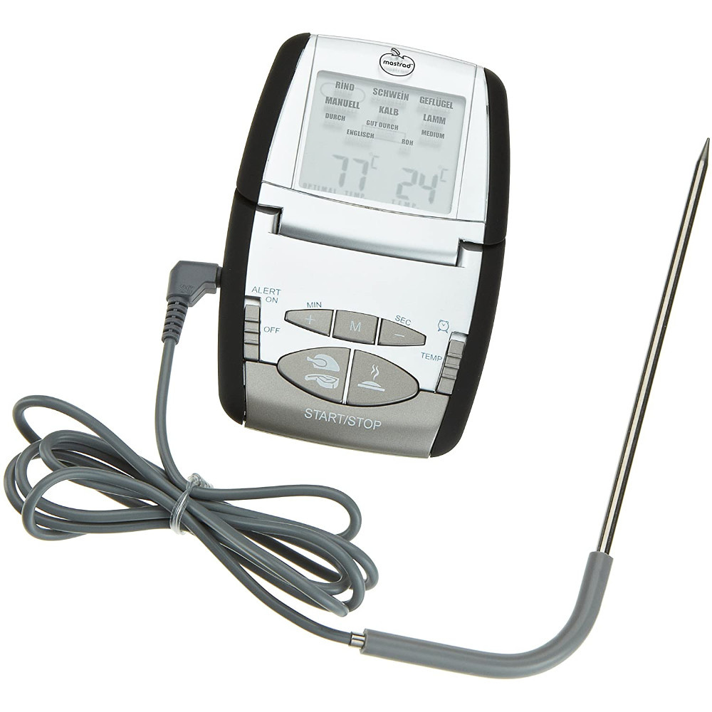 Idealny łosoś, bez zaglądania do piekarnika non stop, rozpływające się foie gras ... przyrządzenie produktów w "punkt" oznacza, że przeszedłeś już 50% drogi do bycia kucharzem. Dzięki termosondzie z Mastrada uchwycisz moment idealnego wysmażenia czy upieczenia a to już połowa sukcesu. Aby przyrządzić średnio wysmażony rostbef, wystarczy wybrać temperaturę lub tryb pieczenia zaprogramowany w urządzeniu, wsunąć sondę w mięso a urządzenie umieścić na zewnątrz bezpośrednio na metalowej obudowie piekarnika. Na tylnej ściance znajdą się 2 silne magnesy, umożliwiające umocowanie na metalowych elementach. Pamiętaj muszą one pozostawać chłodne, nie nagrzewać się w trakcie pieczenia. Po osiągnięciu pożądanego stopnia przyrządzenia rozlegnie się alarm. Sonda sprawdzi się również przy robieniu konfitur i dżemów, praktyczny klips pozwoli umieścić sondę na garnku. Uwagi dotyczące użytkowania: Sondę należy umieszczać w środku przygotowanej potrawy, nie na brzegu. Przed rozpoczęciem pomiaru należy upewnić się, że sonda jest zimna, a następnie wyjąć i włożyć baterię. Sondę i kabel czyścimy wilgotną ściereczką, nie należy zanurzać w wodzie urządzenia. Nie wolno wkładać urządzenia do piekarnika, powinno ono pozostawać na zewnątrz: w piekarniku pozostaje sonda i kabel łączący z urządzeniem bazowym. Nie dotykaj sondy i kabla wyjmując z piekarnika, są one gorące i możesz poparzyć się. Urządzenie przeznaczone jest do mierzenia temperatury, maksymalnie do 210 stopni Celsjusza. Jeżeli użyjesz urządzenia powyżej tej temperatury, urządzenie wyświetli komunikat "HI" a gwarancja straci ważność.Urządzenie działa na baterię R03(AB) AAA 1,5 V ( 1 w zestawie). Korzystanie ze wstępnie zaprogramowanych czasów i temperatur Przed rozpoczęciem pracy umieść na ekranie w wybranym języku menu do wyboru: hiszpański, francuski, niderlandzki,włoski, niemiecki lub angielski, brak w języku polskim, to Ci zdecydowanie ułatwi pracę z urządzeniem. W menu znajdziesz: rodzaje mięs i stopień wysmażenia/upieczenia oraz funkcję manual do ręcznego ustawiania czasu i temperatury. Do wyboru: wołowina, wieprzowina drób, cielęcina i jagnięcina, stopnie to: done, well, medium med, rare i rare. Wybierz rodzaj mięsa używając przycisku A, stopień przyrządzenia - B, alarm włączysz suwakiem C. Umieść sondę w mięsie przed włożeniem do piekarnika, mierzenie temperatury uruchamiasz przyciskiem E. Po osiągnięciu odpowiedniego stopnia przyrządzenia w urządzeniu włączy się alarm Ręczne ustawianie czasu i temperatur Wybierz temperaturę za pomocą suwaka D i włącz urządzenie przyciskiem suwakiem C - pozycja ON, wybierz z Menu funkcję MANUAL używając przycisku A a następnie naciśnij M wyświetli się temperatura +/- pozwoli Ci wybrać pożądaną, zatwierdź za pomocą M. Umieść sondę w mięsie przed włożeniem do piekarnika, mierzenie temperatury uruchamiasz przyciskiem E. Analogicznie ustawiasz alarm.