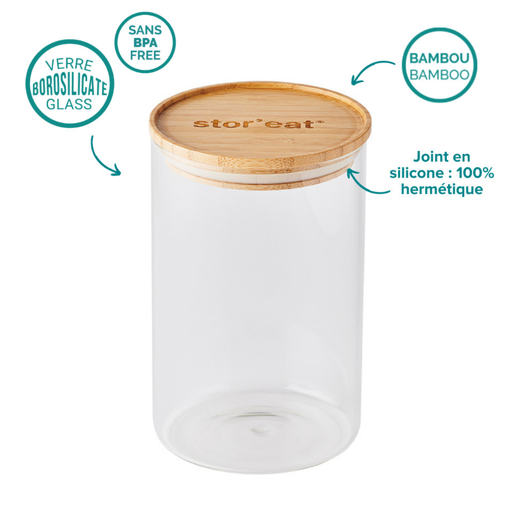 Pojemnik został wykonany ze szkła borokrzemowego. Szkło jest idealnym materiałem do przechowywania żywności, a szkło borokrzemowe jest cienkie, lekkie i wyjątkowo wytrzymałe. Pokrywka z bambusa z silikonową uszczelką, nie tylko dobrze zabezpiecza zawartość, pełni też funkcję łącznika pomiędzy słoikami. Została zaprojektowana tak, aby można było postawić słoiki jeden na drugim. Jej wysoki na 0,5 cm brzeg zabezpiecza przed przypadkowym ześliźnięciem się naczynia. Do pojemnika załączono 1 naklejkę z kodem QR. W celu zainstalowania aplikacji Stor’eat na swoim telefonie, wyszukaj ją w sklepie Google play, App Store lub na stronie www.stor-eat.com. Aplikacja pomoże Ci w codziennym zarządzaniu Twoimi zapasami jedzenia. Skanuj przy jej pomocy kody kreskowe na produktach oraz kody QR dołączone do produktów marki Mastrad. Po zeskanowaniu kodu kreskowego produktu spożywczego, aplikacja zazwyczaj samodzielnie rozpoznaje rodzaj produktu. W razie nierozpoznania konkretnego produktu, należy samodzielnie wprowadzić dane na jego temat do aplikacji. Po wprowadzeniu daty przydatności do spożycia, można ustawić sobie przypomnienie, dzięki któremu już nigdy nie zapomnisz zjeść swoich ulubionych potraw i przekąsek zanim się one popsują. Aplikacja Stor’eat jest całkowicie darmowa. Materiał: szkło borokrzemowe, pokrywka bambus, uszczelka silikon.