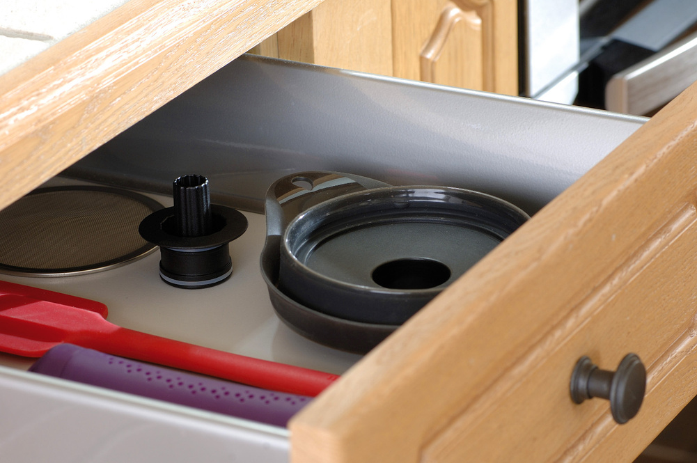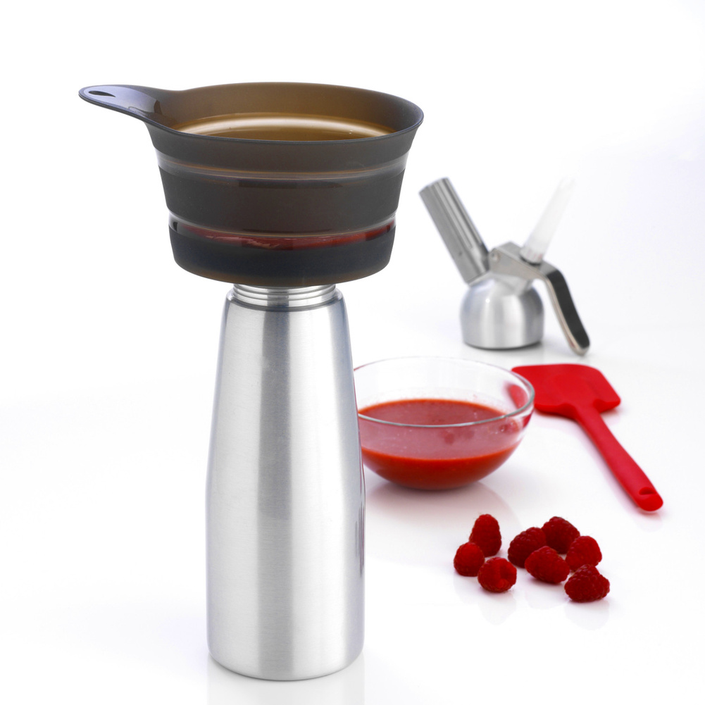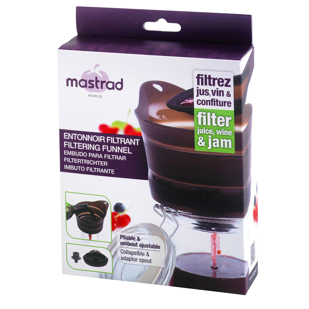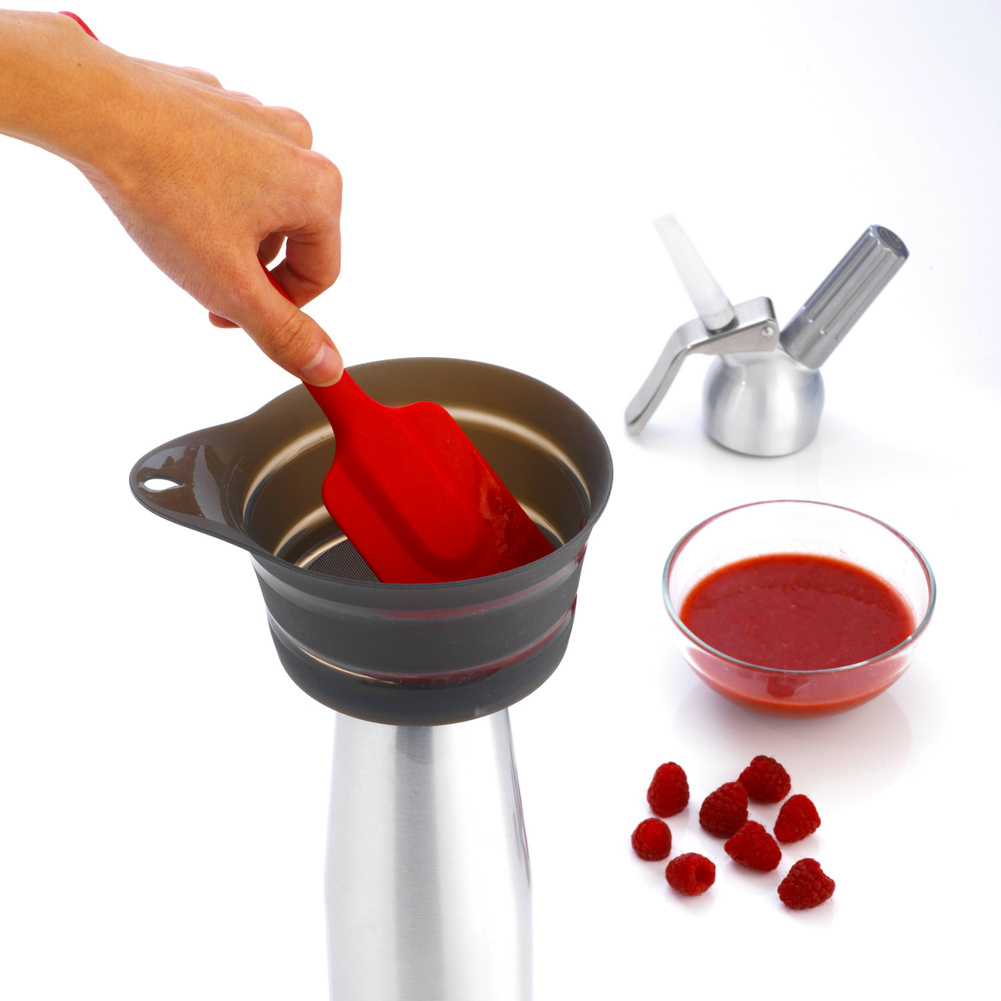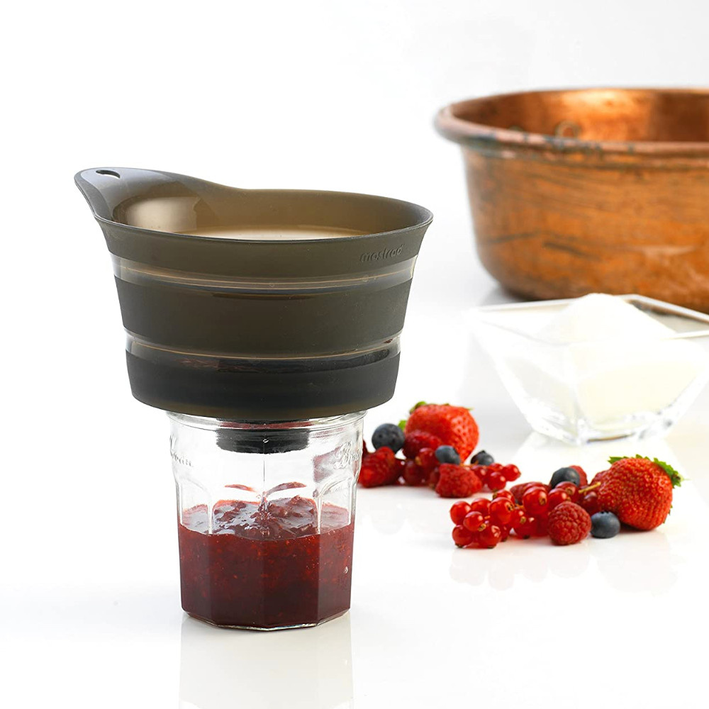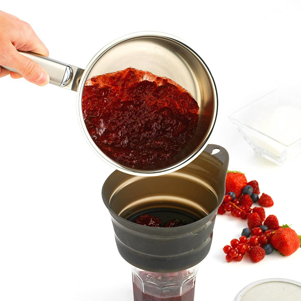 Lejek nie zajmuje dużo miejsca w przechowaniu dzięki silikonowemu, składanemu brzegowi. Spód lejka wykonany jest z twardego tworzywa, które zapewnia stabilne podparcie w trakcie pracy. Dwie szerokości wlewu sprawiają, że lejek pasuje i na słoiki, i na butelki. Sito z drobnymi otworami przefiltruje wino, soki i inne płyny. Sito typu drobna siatka, rozmiar pojedynczego otworu poniżej 1mm. Materiał: silikon, plastik, stal nierdzewna.