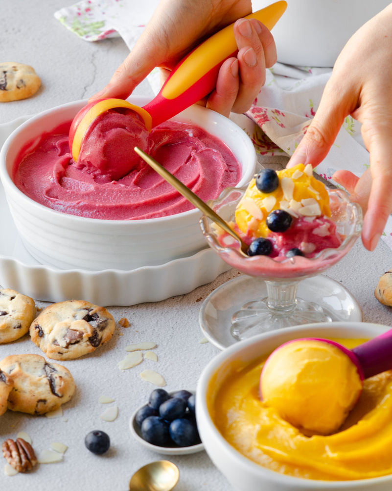 Łyżka, która bez najmniejszego wysiłku pozwoli nabierać i nakładać kulki lodów i sorbetów. Łyżka łączy wytrzymałość z elastycznością - jest na tyle mocna, by łatwo nabrać zmarzniętą masę, a elastyczne część ułatwia nałożenie lodów do pucharków lub wafelków. Dół łyżki jest wykonany z miękkiego materiału, który można nacisnąć palcem. W ten sposób można wypchnąć gałkę z łyżki. Ergonomiczna rączka zapewnia dobry uchwyt, niezależnie w prawej czy lewej ręce. Brak ruchomych części, które mogą się złamać, sprawia, że narzędzie jest wytrzymałe. Łyżka może również służyć do formowania kulek z warzywnego puree, ryżu, kasz. Przyda się także do ciasteczek.