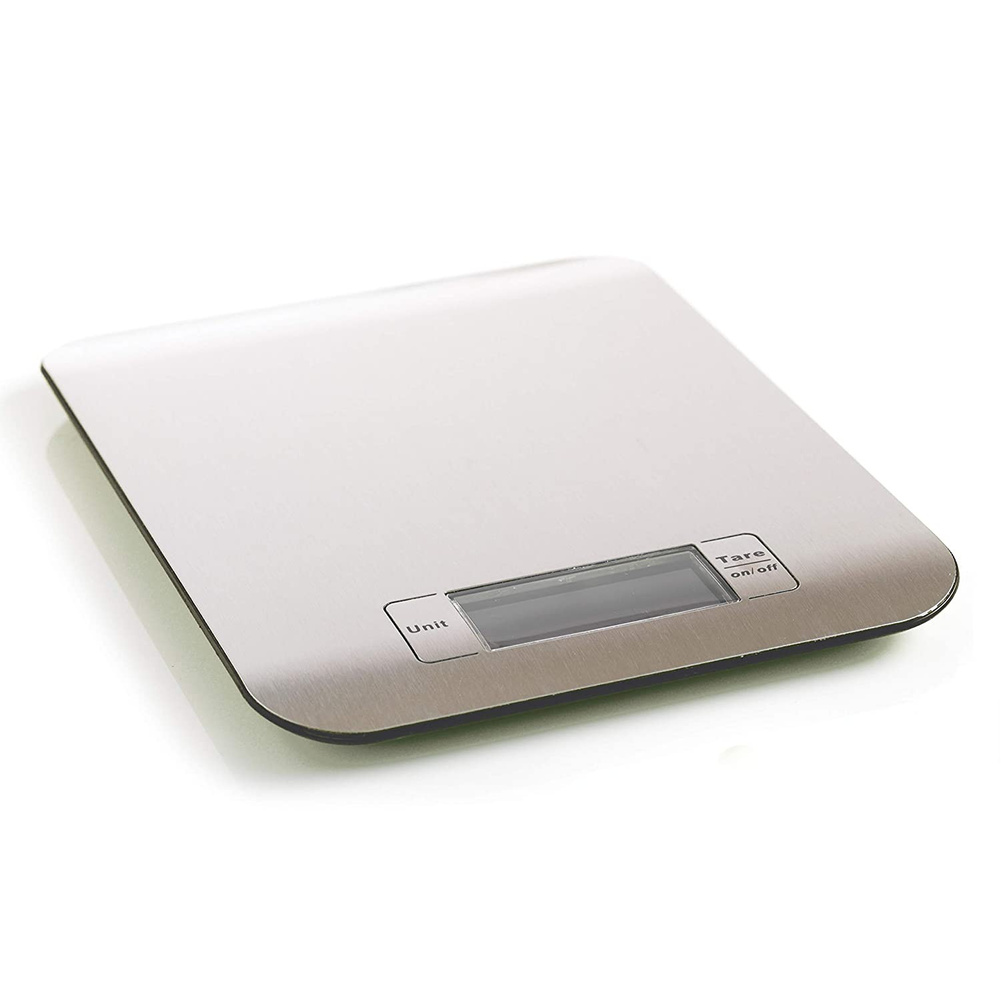 Waga stalowa czarna. Zważ wszystkie składniki z dokładnością co do 1 grama, nawet do 5 kg! Wyjątkowo płaska i lekka waga wykonana z wytrzymałej stali nierdzewnej waży w gramach, kilogramach, funtach i uncjach, z funkcją TARE i podświetlanym wyświetlaczem ułatwiającym odczyt. Waga jest stabilna dzięki antypoślizgowym nóżkom. W zestawie 2 baterie typu CR2032 3V.