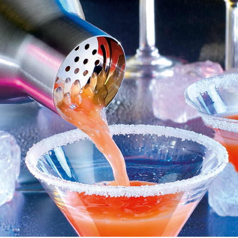 Shaker ma wygodną pokrywkę, która ma specjalne sitko do zatrzymywania lodu i innych dodatków, które nie powinny znaleźć się w drinku. Na wewnętrznej ściance stalowego pojemnika została rozrysowana miarka, która ułatwia odmierzanie składników, poczynając od 100 ml.