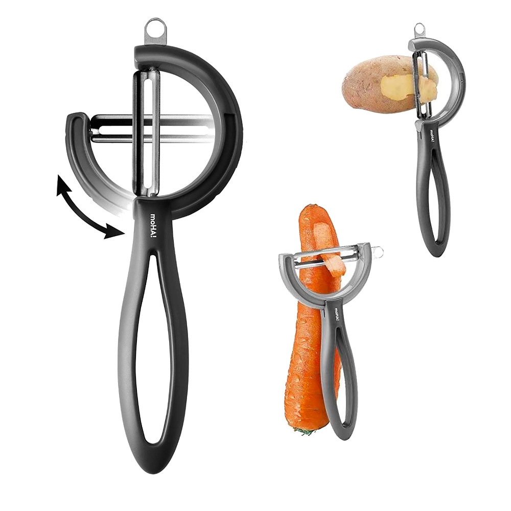 Nareszcie obieraczka, która dostosuje się do Ciebie, a nie Ty do niej! Obieraczka Reverso Veggie ma obrotowe ostrze. Dzięki temu łatwo dostosować ją do Twojego stylu obierania i ułożenia dłoni, ale również do kształtu warzywa. Wiadomo, że podłużne warzywa dużo łatwiej obierać poziomymi ostrzami – przekręcasz tylko ostrze Reverso. Z kolei obierając ziemniaki wygodniejsza jest pionowa obieraczka – obracasz ostrze Reverso do pionu. Obieraczka Reverso została tak zaprojektowana, by łatwo dopasować się do każdej dłoni, co sprawia, że obieranie jest łatwe i niemal bez wysiłku. Reverso to obieraczka, która łączy w sobie wygodę, wytrzymałość, jest poręczna i łatwo się nią posługiwać. To sprawia, że jest obowiązkowa, w każdej kuchni, gdzie ceni się przedmioty wysokiej jakości. Ostrze zostało wykonane ze stali nierdzewnej, zaś rączka i obudowa z tworzyw sztucznych wysokiej jakości. Pionowe ostrze ma specjalne oczko do usuwania niechcianych miejsc z ziemniaków. Obrotowe ostrze pozwala obierać warzywa w obu kierunkach, więc nadaje się również dla osób leworęcznych. Jakkolwiek obieraczkę Reverso można myć w zmywarce, ale preferuje się mycie ręczne, wtedy obieraczka zachowa swoją ostrość na dłużej!