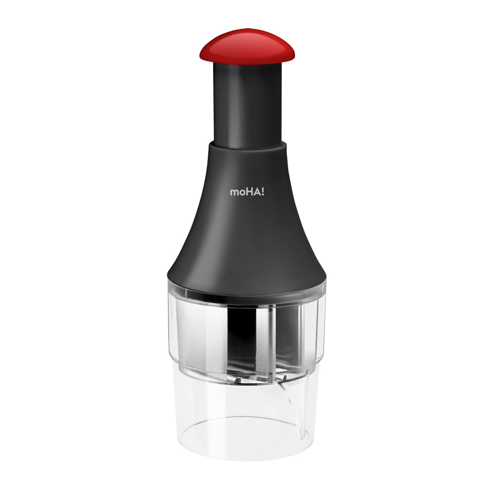 Sposób użycia: cebulę umieścić w szarym pojemniku, nałóż szatkownicę a następnie kilkukrotnie przydusić tłok a cebula zostanie posiekana. Rotacyjny mechanizm obraca ostrza szatkownicy po każdym przyciśnięciu i zluzowaniu tłoka. Boczny skrobak obracającą się podczas pracy zgarniając wszystko ze ścianek. Antypoślizgowa główka tłoka ułatwia pracę. Używając szatkownicy nie potrzebujesz deski do krojenia, możesz siekać w pojemniku, lub na pokrywce kontrolując postęp w szatkowaniu. Zaleca się czyścić ręcznie, pojemnik i pokrywkę można myć w zmywarce. Szatkownica łatwo rozbiera się na poszczególne elementy, które wystarczy opłukać strumieniem bieżącej ciepłej wody po użyciu, aby wyczyścić. Materiał: stal nierdzewna, tworzywo sztuczne.