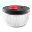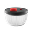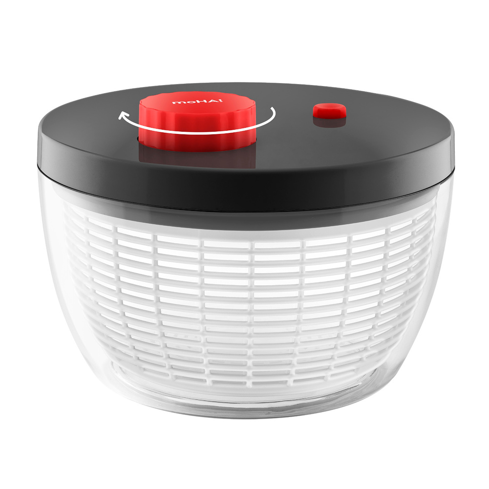 Dzięki zupełnie nowemu, opatentowanemu mechanizmowi wirowanie sałaty stało się proste. Wystarczy obrócić pokrętło obrotu (większy, czerwony przycisk na pokrywie) 2–3 razy, a kosz zacznie się obracać z dużą prędkością. Mały przycisk służy do przerwania wirowania. Miska posiada antypoślizgową podstawę i może służyć również jako elegancka salaterka. Kosza możemy używać jako durszlaku do odcedzania i płukania. Materiał: ABS, PP, SAN, silikon. Przybliżone wymiary: - wysokość: 18cm, - średnica góra: 24,7cm, - średnica dół: 18cm. Przybliżone wymiary brutto: - wysokość: 25,7cm, - długość: 18,8cm, - szerokość: 25,8cm. Przybliżona waga brutto: 1,374kg. Opakowanie: kartonowe pudełko prezentowe.