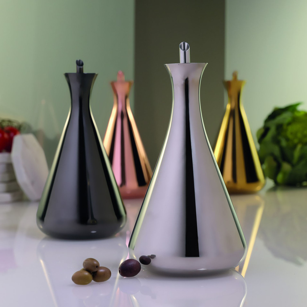 Ta butelka na oliwę ze stali nierdzewnej o pojemności 500ml, charakteryzująca się eleganckim zaokrąglonym kształtem z lśniącą powierzchnią przypomina dawne szklane ampuły. Stal nierdzewna jest materiałem zdolnym do zachowania organoleptycznych właściwości oliwy wraz z upływem czasu poprzez zagwarantowanie maksymalnej ochrony przed światłem, powietrzem oraz zapachami, zapobiegając utlenianiu oraz pozostałym procesom degradacyjnym. Została wyposażona w praktyczny, wykonany ze stali nierdzewnej, nalewak zapobiegający kapaniu do jak najlepszego kontrolowania przepływu oliwy. Łatwa w czyszczeniu. Można myć w zmywarce. Materiał: stal nierdzewna. Pojemność: 0,5L. Wymiary: 20x10,6cm. Waga netto: 0,240kg.