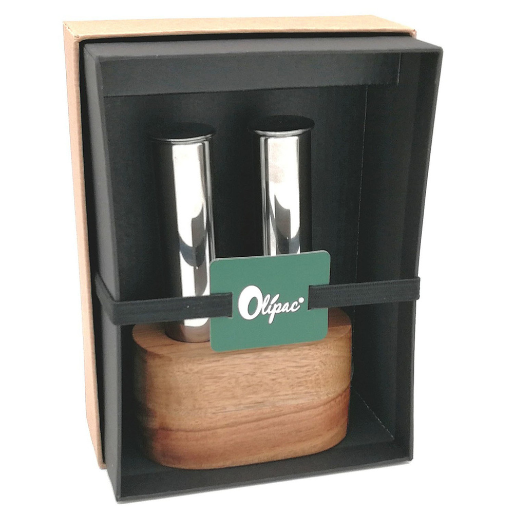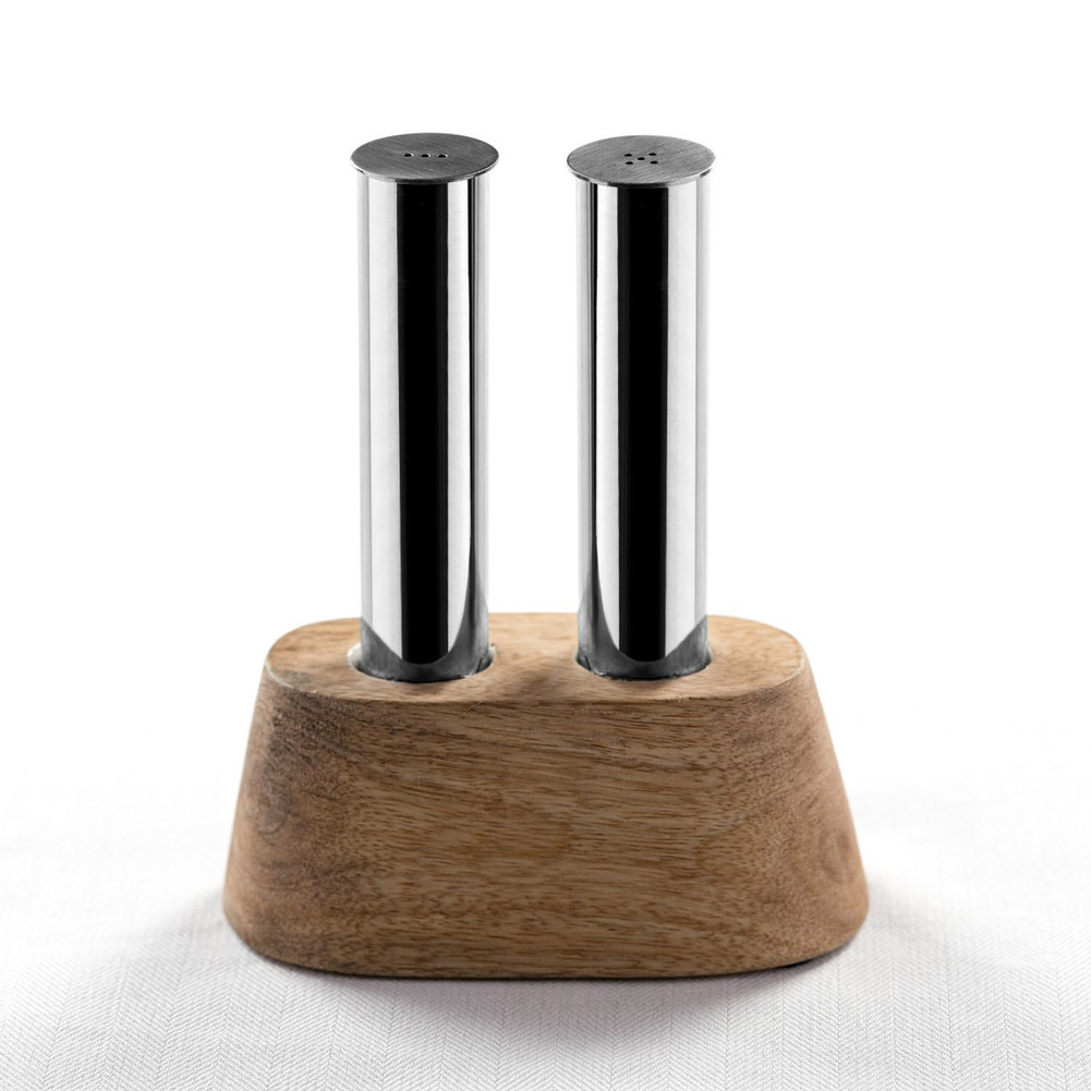 Przyprawnik składający się z solniczki i pieprzniczki wykonanych ze stali nierdzewnej i przechowywanych w drewnianej podstawce. Zestaw został wykonany elegancko i nowocześnie, dzięki czemu prezentuje się w wspaniały sposób na stole. Pieprzniczki i solniczki są łatwe w napełnianiu i można je myć w zmywarce. Materiał: stal nierdzewna, drewno. Wymiary brutto: 15,8x11x7cm. Wymiary netto: 9,3x13,5x5,3cm. Waga netto: 0,184kg. Waga brutto:0,303kg.