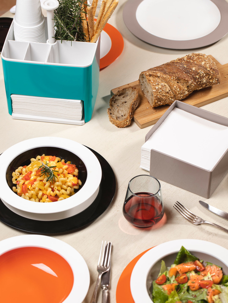 Organizer stołowy Readytable jest wszechstronnym narzędziem kuchennym pozwalającym przechowywać różnorodne rzeczy, takie jak sztućce, szklanki, serwetki w jednym miejscu bez potrzeby nakrywania stołu dla każdego z osobna. Jego zdolność do adaptacji sprawia, że jest on świetnym rozwiązaniem na różne okazje, jak obiad, śniadanie czy krótka przerwa na kawę lub herbatę. Sprawdzi się także jako zestaw, w którym można umieścić różne przyprawy. Eat Pop jest kolekcją łączącą kolory z osobowościami. Każdy z kolorów ma odmienne znaczenie, odnoszące się do różnych osobowości. Czarny dla otwartych, żółty dla optymistów, a niebieski dla spokojnych. Życie bez kolorów byłoby nieznośne. Przedmioty z kolekcji Eat Pop mogą być używane w kuchence mikrofalowej, przechowywane w zamrażalce oraz myte w zmywarce, jednakże zaleca się mycie ręczne w celu jak najdłuższego zachowania estetycznej powierzchni produktów. Uszkodzenia powstałe w wyniku mycia w zmywarce nie podlegają reklamacji. Produkty kolekcji Eat Pop są w pełni bezpieczne w kontakcie z jedzeniem, nie zawierają melaminy ani bisfenoli oraz nie przyjmują i nie przenoszą żadnych zapachów. Przeznaczone do użytku domowego oraz zewnętrznego.