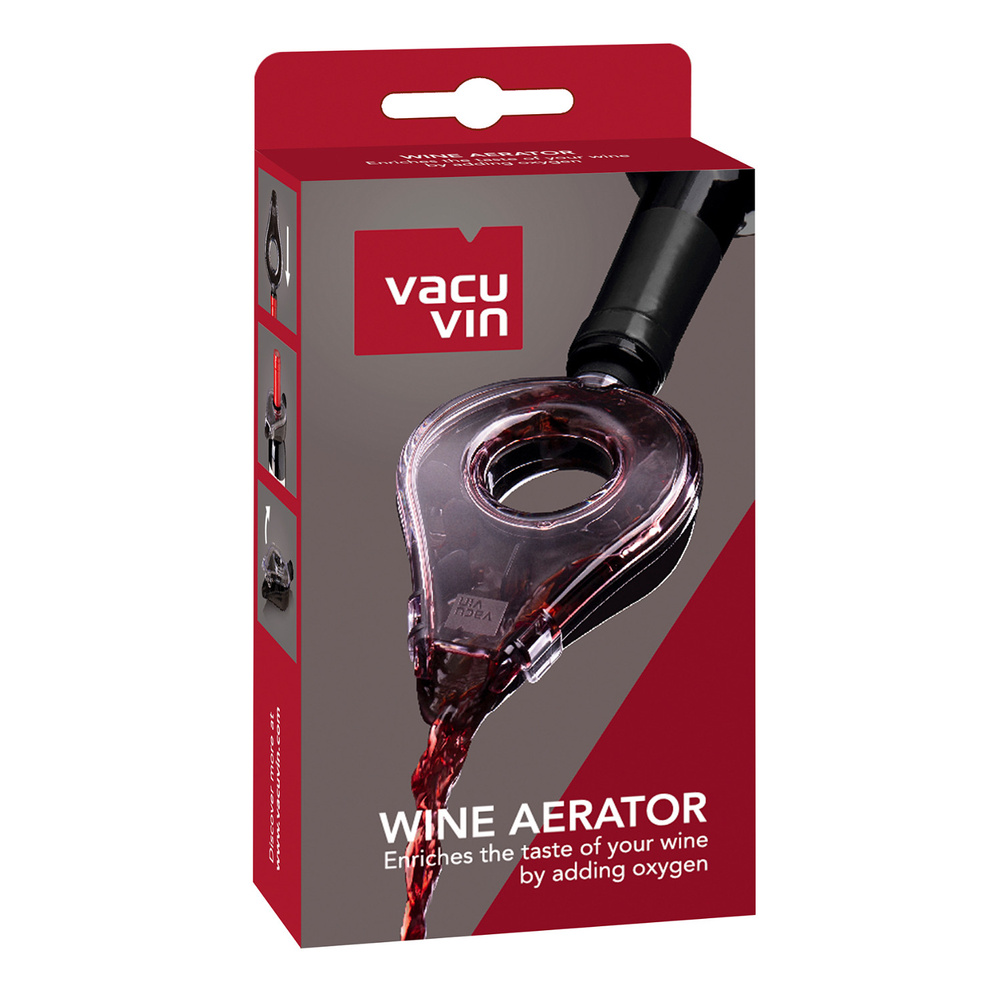 Specjalnie zaprojektowany kształt aeratora powoduje, że nalewanie wina do kieliszka wydłuża się. Dzięki temu wino ma możliwość pochłonięcia dodatkowego tlenu, który wzbogaci jego smak. Przezroczysty wierzch aeratora pozwala śledzić drogę wina z butelki do kieliszka oraz wychwycić ewentualne osady i przerwania nalewania, by zapobiec ich dostaniu się do kieliszka lub karafki.