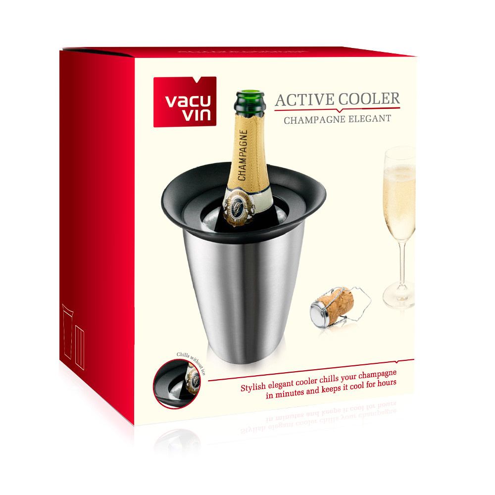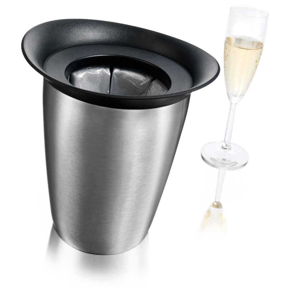 Pozwala na szybkie schłodzenie butelki szampana. Wystarczy 5 minut i odpowiednio niska temperatura utrzymuje się wiele godzin-bez lodu!. Wykończenie stal nierdzewna. Elementy chłodzące należy przechowywać przed użyciem w zamrażarce.