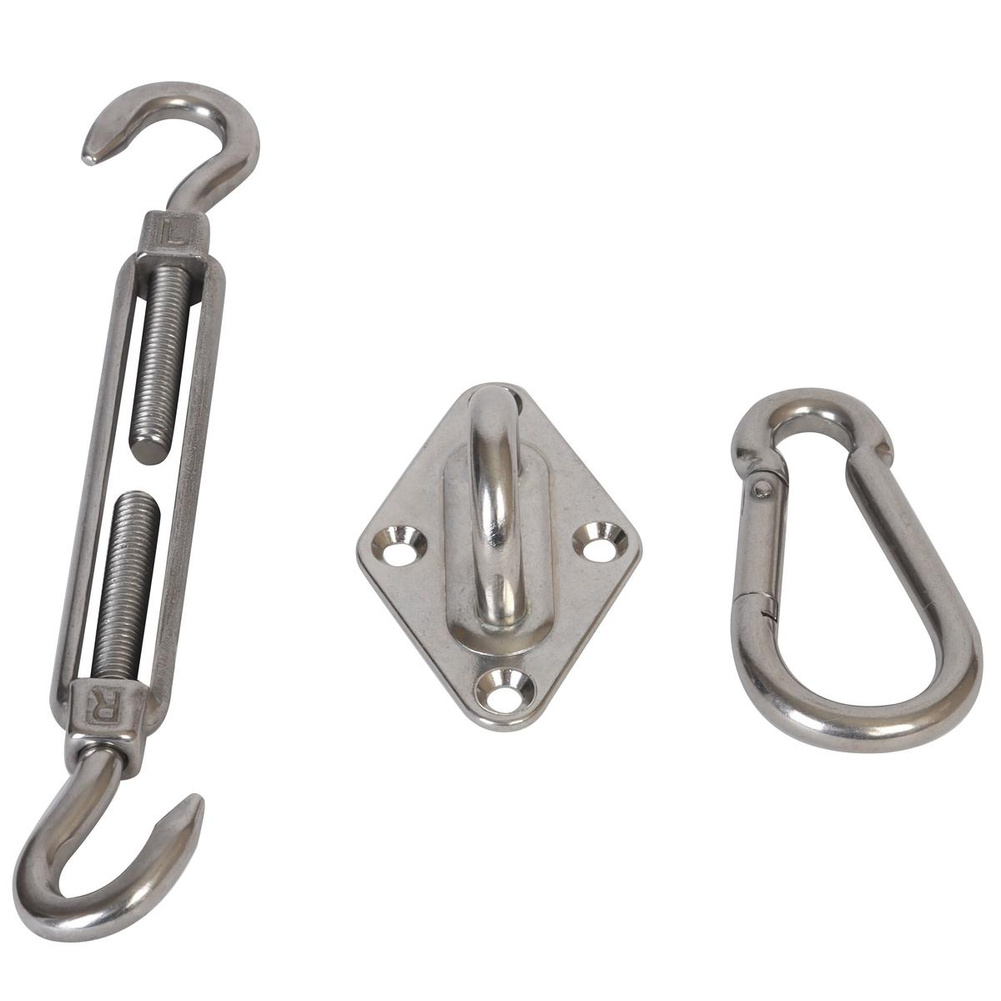 Zestaw pasuje do różnych rodzajów żagli przeciwsłonecznych i może być montowany na ścianach, słupach czy innych powierzchniach.
