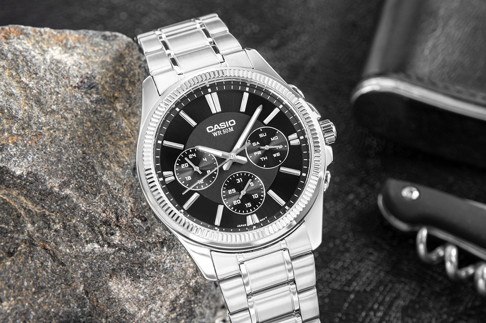 CASIO MTP-1375D-1AVDF to zegarek dla mężczyzny, który lubi mieć wszystko pod kontrolą – styl, czas i jakość. Klasyczna stalowa konstrukcja z powłoką jonową gwarantuje trwałość i odporność na codzienne wyzwania, a czarna tarcza z eleganckimi srebrnymi akcentami dodaje charakteru każdej stylizacji – od garnituru po jeansy. Subtarcze pokazujące dzień tygodnia, datę i godzinę w trybie 24h dają Ci pełen obraz sytuacji za jednym spojrzeniem, bez sięgania po telefon. Wodoszczelność do 50 metrów i dokładność mechanizmu (±20 sekund/miesiąc) to spokój ducha – nie musisz się martwić o pogodę, przypadkowe zachlapania czy spóźnienia. Całość tworzy wyrazisty, męski styl, który przyciąga spojrzenia i sprawia, że zegarek prezentuje się znacznie powyżej swojej klasy cenowej.