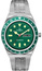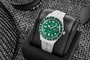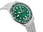 Zielona tarcza zegarka została wykończona w stylu „sunburst”, który pięknie odbija światło, nadając głębi kolorowi. Wyposażona jest w wyraźne, luminescencyjne indeksy i wskazówki, zapewniające doskonałą czytelność nawet w ciemności. Zamiast cyfr zastosowano geometryczne markery – koła i prostokąty – które przywołują stylistykę nurkowych modeli sprzed dekad.