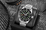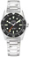 Czarna stalowa koperta przyciąga uwagę wyrazistą, zębatą lunetą i tarczą ozdobioną falistym wzorem, który dodaje głębi i nawiązuje do wodnego żywiołu. Jednokierunkowy obrotowy bezel umożliwia precyzyjne i bezpieczne odmierzanie czasu pod wodą – niezbędna funkcja dla każdego nurka. Prosta, ale przemyślana kompozycja tarczy zapewnia maksymalną czytelność nawet w warunkach ograniczonej widoczności. Całość dopełnia czerwony sekundnik z luminescencją, który podkreśla dynamiczny i sportowy charakter tego modelu.