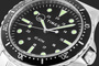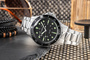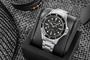 Tarcza tego modelu przyciąga wzrok swoją surową, wojskową estetyką i maksymalną czytelnością. Jej matowe wykończenie redukuje odbicia światła, a wyraźne cyfry i kontrastujące indeksy zapewniają szybki odczyt w każdych warunkach. Masywne wskazówki – godzinowa i minutowa – mają charakterystyczne, wypełnione luminą groty z wyciętym okręgiem, który ułatwia orientację i precyzyjne ustawienie czasu.