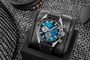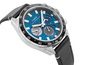 Design zegarka przyciąga wzrok dopracowaną kompozycją i dynamiczną kolorystyką. Głęboki granat tarczy w połączeniu z trójwymiarowymi subtarczami tworzy kontrast i wrażenie głębi, które przywołuje skojarzenia z klasycznymi wskaźnikami samochodowego kokpitu. Zaznaczone czerwienią końcówki indeksów godzinowych oraz masywne znaczniki na godzinach 3, 9 i 12 zapewniają nie tylko świetną czytelność, ale i równowagę wizualną – całość prezentuje się sportowo, nowocześnie i z nutą retro.