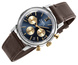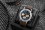 Projekt zegarka czerpie ze stylistyki lat 60., a jego tarcza przypomina klasyczny kokpit samochodowy – pełen charakteru i eleganckich detali. Granatowe tło z wykończeniem sunray efektownie odbija światło, a zagłębione złote subtarcze tworzą wyrazisty, ale wciąż harmonijny kontrast. Wyjątkowe indeksy na godzinach 3, 9 i 12 nadają tarczy równowagę i rytm, a ich kształt i połysk nie tylko przyciągają wzrok, ale też podkreślają retro klimat tego modelu.