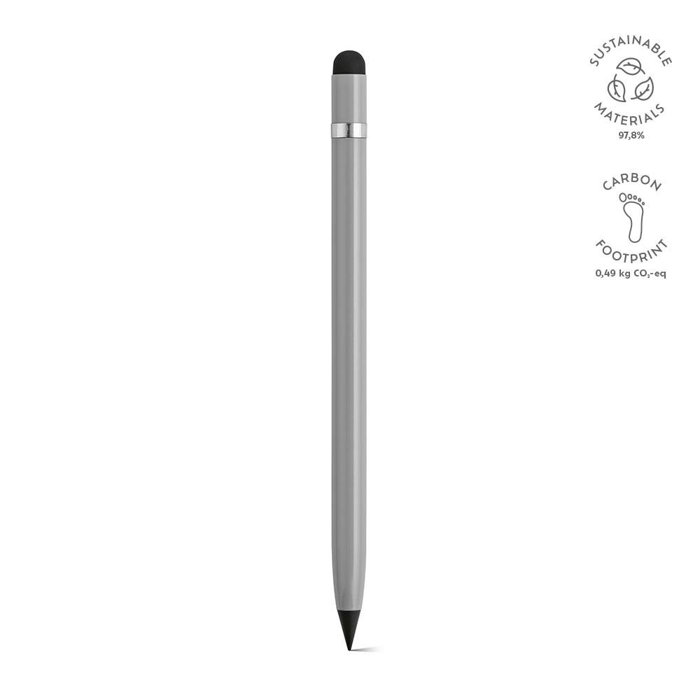 Wykonane z aluminium pochodzącego z recyklingu pióro atramentowe na nowo definiuje pisanie - jest to nieskończone pióro z grafitową końcówką. Wzbogacony o antypoślizgowy srebrny detal, wewnętrzną gumkę i końcówkę dotykową. Prezentowany w indywidualnym pudełku z papieru z recyklingu.