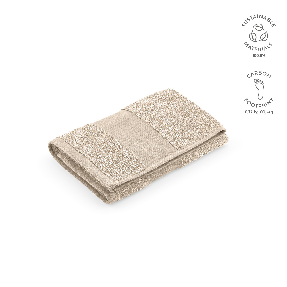 Użyj tego ręcznika frotte do twarzy o gramaturze 370 g/m², aby delikatnie oczyścić twarz: bawełna z recyklingu (60% bawełny z recyklingu i 40% bawełny) pozostawi skórę odświeżoną. Wyprodukowany w Portugalii, ma wymiary 30 x 50 cm i jest dostarczany z opaską z nadrukiem i bawełnianym wieszakiem; zapakowany w biodegradowalną torebkę foliową z recyklingu.