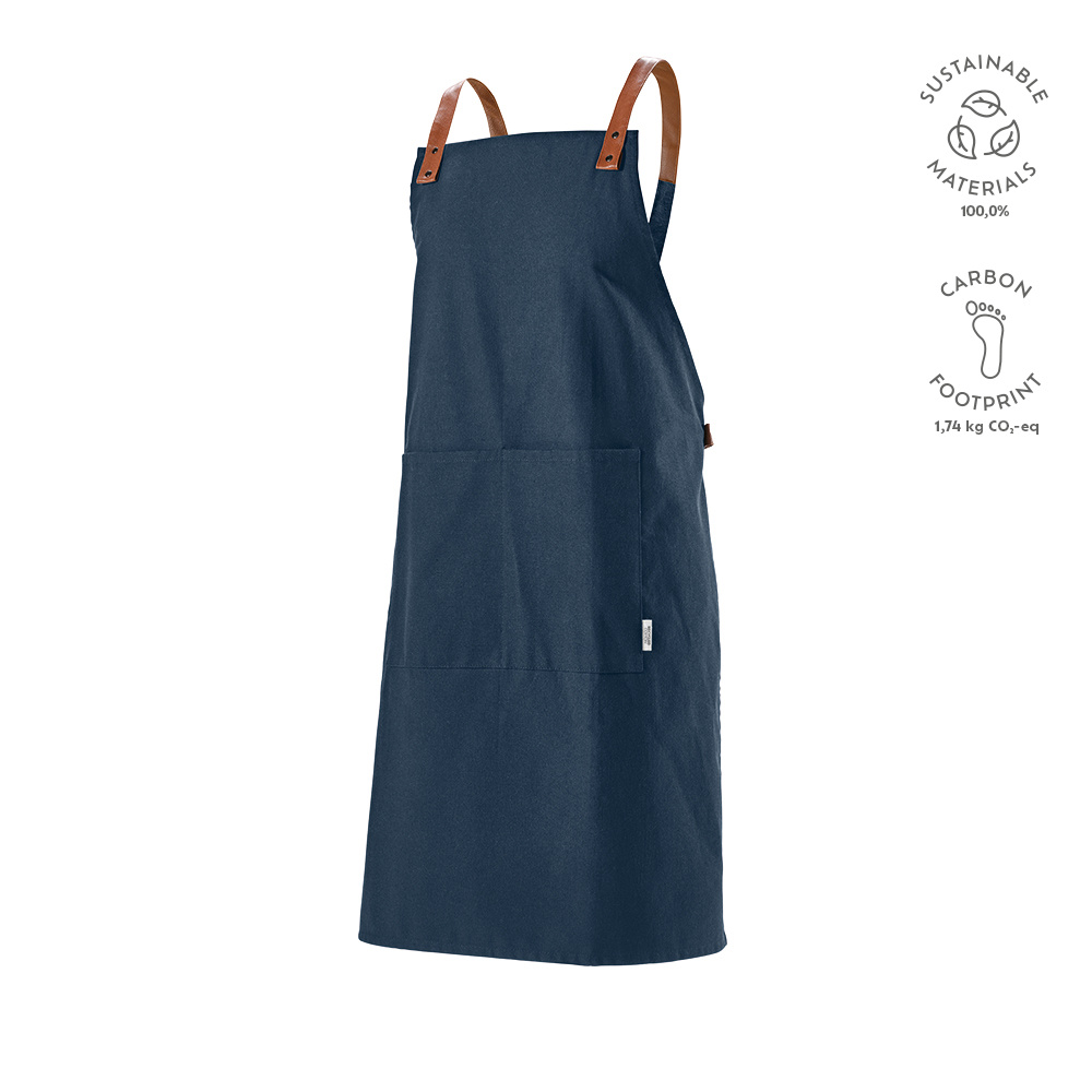 Rozpocznij gotowanie w naszym przyjaznym dla środowiska fartuchu o wymiarach 70 x 90 cm z wygodnej bawełny z recyklingu. Dwie przednie kieszenie na niezbędne drobiazgi i stylowe detale z PU z recyklingu. To zrównoważony wybór, nawet jego opakowanie jest wykonane z kartonu pochodzącego z recyklingu.