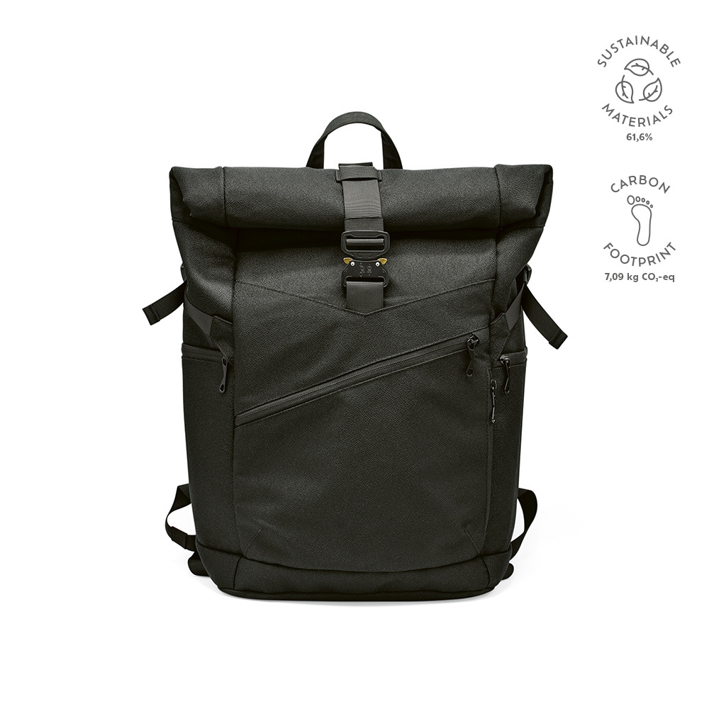 Skrupulatnie zaprojektowany plecak o pojemnosci 28 litrów jest wykonany z materialu rPET. Posiada wysokiej jakosci zapiecie na rolowana klamre. Na wyscielanych plecach znajduje sie pasek do wózka i ukryta kieszen. Wzmocniony uchwyt i paski. Pakowane indywidualnie w torby polietylenowe z recyklingu.