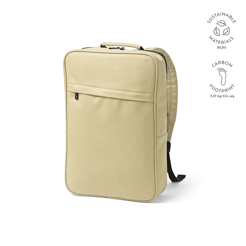 Udoskonal swój styl w zrównoważony sposób dzięki naszemu plecakowi z PU pochodzącego z recyklingu. Przekątny termicznie wszyty zamek błyskawiczny z przodu. Pojedyncza komora z kieszenią na laptopa 17''. Wyściełanie pleców, pasek na kółkach i wzmocniony uchwyt zapewniają wygodę.
