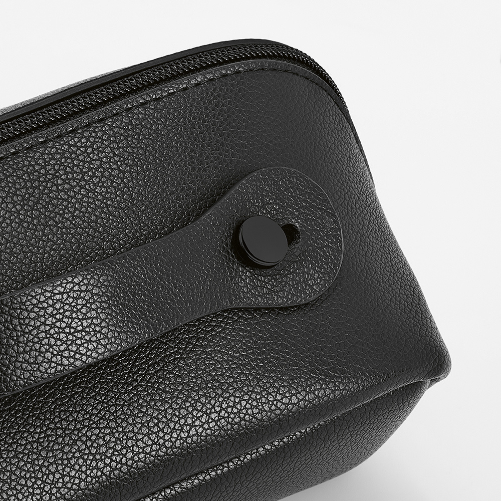 Nasza kosmetyczka z recyklingowanej skóry pozwala bez trudu uporządkować niezbędne drobiazgi. Rozpinany zamek błyskawiczny odsłania dwie duże przegrody (3,5L). Wodoodporna powierzchnia zwiększa trwałość. Zapakowana w pojedynczą biodegradowalną torebkę foliową.