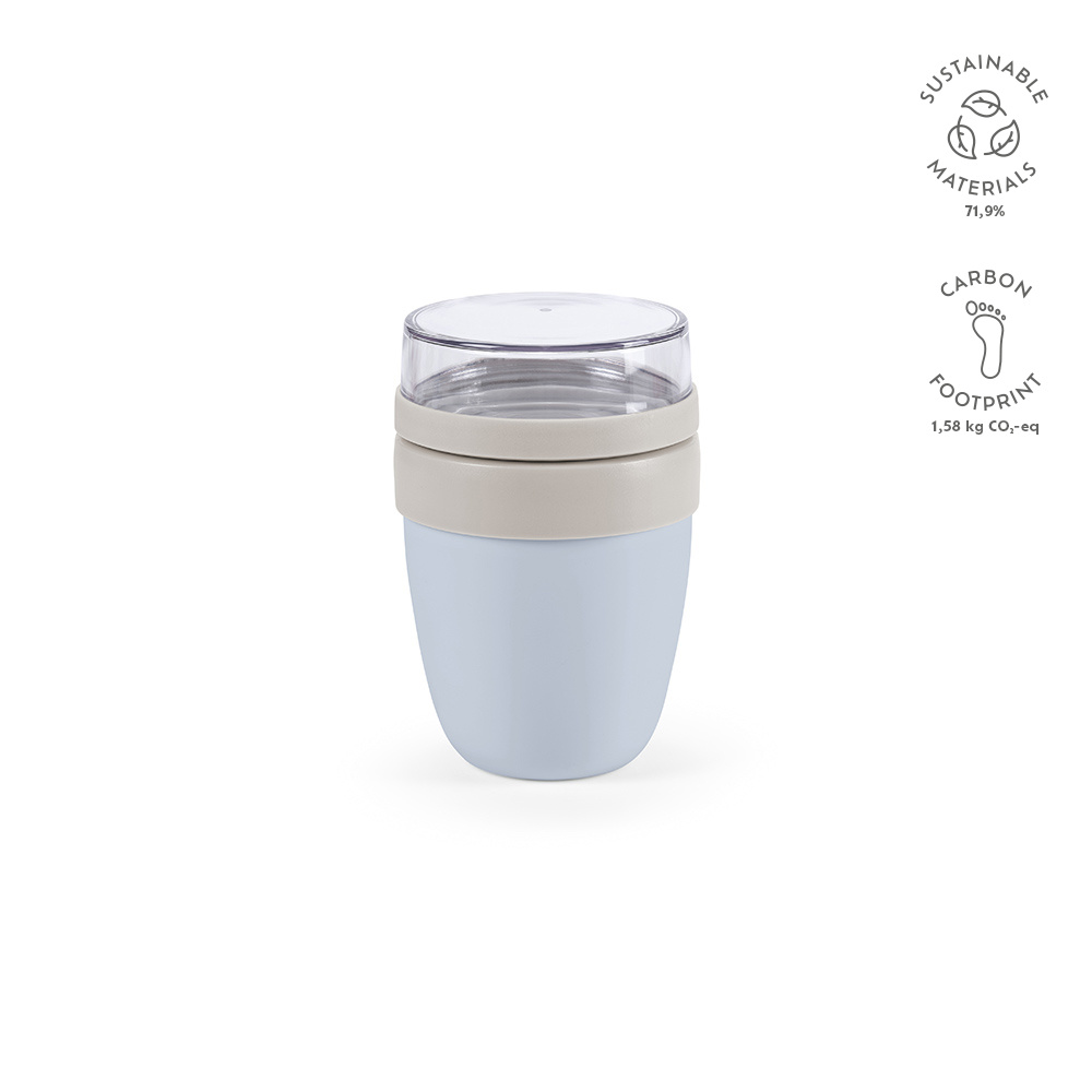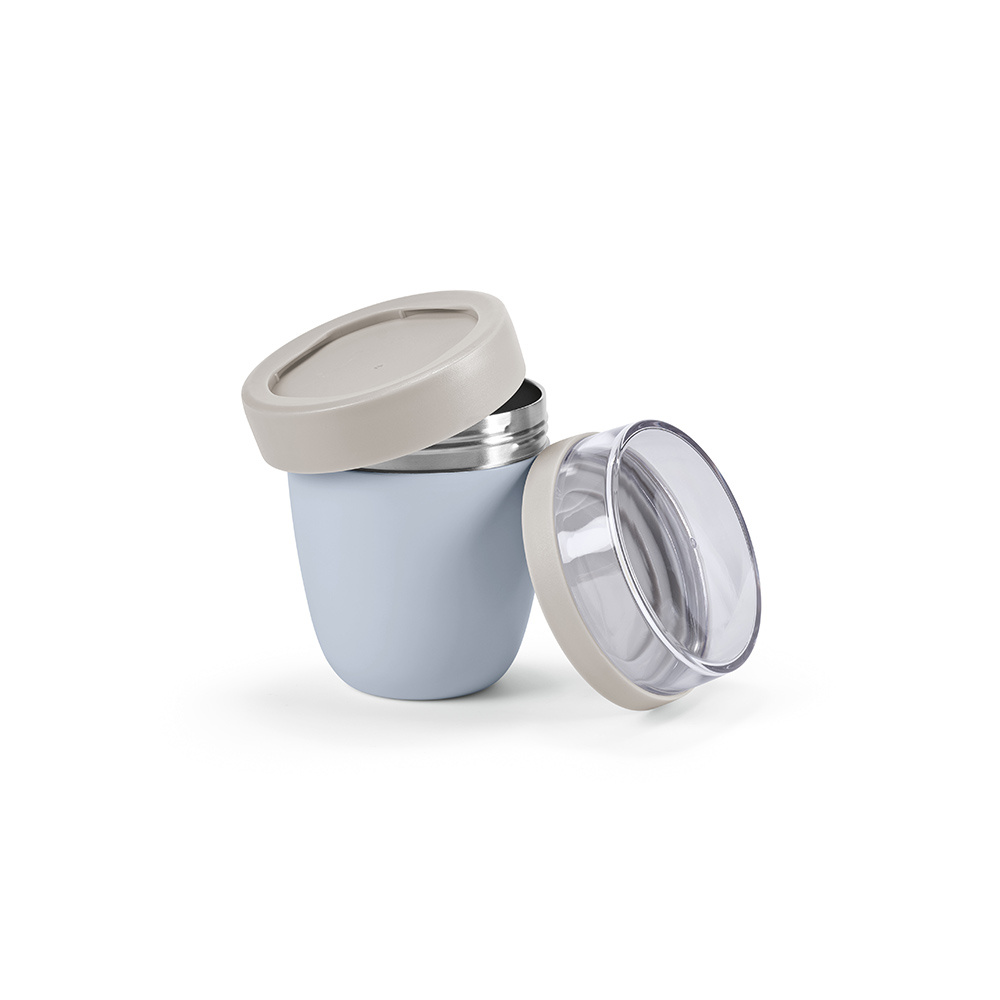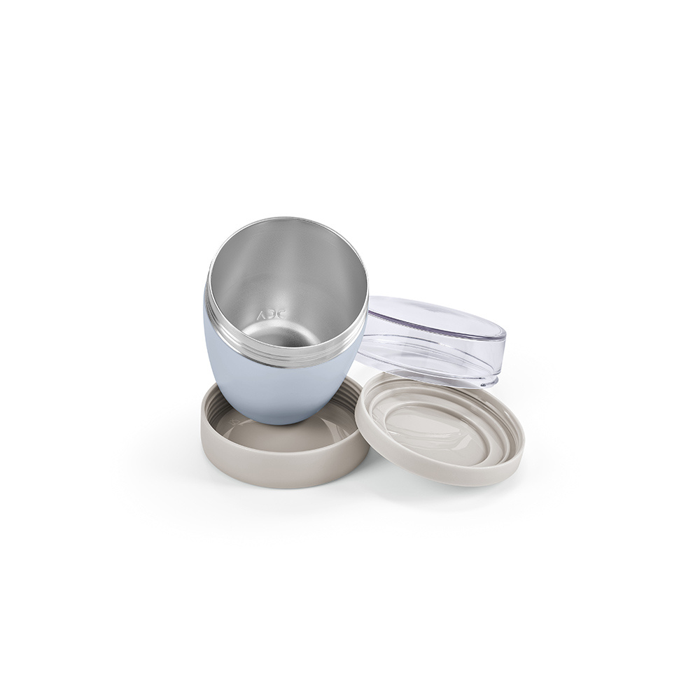 Ten pojemnik na żywność ma 2 komory: dolną o pojemności 530 ml (430 ml netto) ze stali nierdzewnej pochodzącej z recyklingu i plastikową pokrywkę o pojemności 230 ml (110 ml netto). Podwójne ścianki i owalny kształt idealny do zup i grzanek. Szczelna pokrywka pozwala zabrać go ze sobą wszędzie.