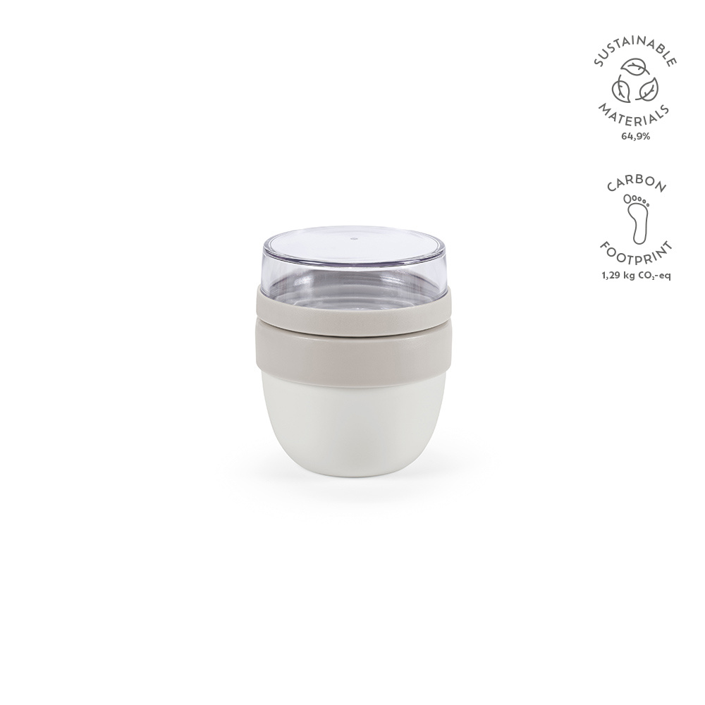 Ten pojemnik na żywność to eko-duet: 350 ml (260 ml netto) stali nierdzewnej pochodzącej z recyklingu i 230 ml (110 ml netto) plastikowej, przezroczystej pokrywki. Urok podwójnych ścianek, owalny wdzięk. Nie rozlewa się, ponieważ jest szczelny. Idealna kombinacja do jogurtu i granoli.