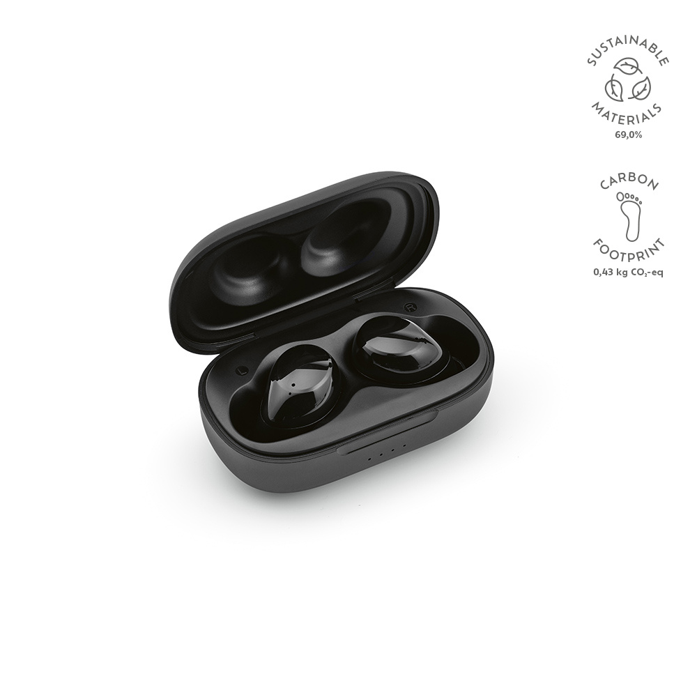 Stylowo ekologiczne: słuchawki rABS i pozioma obudowa. Poziome wyrafinowanie. 5 godzin odtwarzania i 2 godziny ładowania. Etui ładujące ma pojemność 400 mAh, wejście USB-C i zakres częstotliwości 20-20 kHz. Zrównoważony styl, w którym technologia łączy się ze świadomością ekologiczną w doskonałej harmonii.