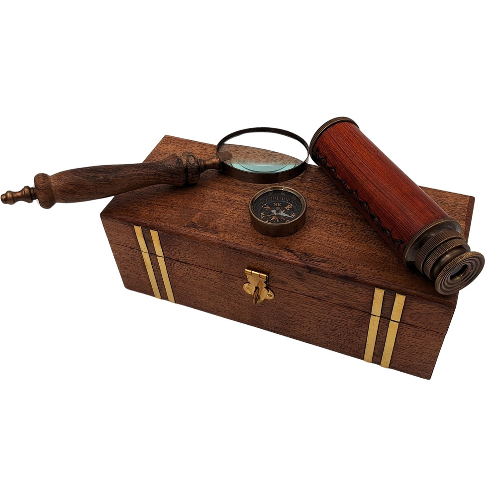 Zestaw podróżnika w stylu retro – idealny prezent dla miłośników przygód, podróży, historii i kolekcjonerskich gadżetów. Składa się z trzech klasycznych instrumentów: lunety, kompasu i lupy, wykonanych z mosiądzu i umieszczonych w eleganckim, drewnianym pudełku.