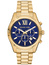 Model Michael Kors MK9153 to elegancki męski zegarek na bransolecie w kolorze złotym wykonanej ze stali szlachetnej. Wyposażony jest w precyzyjny mechanizm kwarcowy, dzięki któremu zegarek dokładanie pokazuje aktualną godzinę. Dostępne funkcje to chronograf, datownik dnia miesiąca oraz 24-godzinne wskazanie czasu. Tarczę ochrania mineralne, odporne na zarysowania szkiełko.