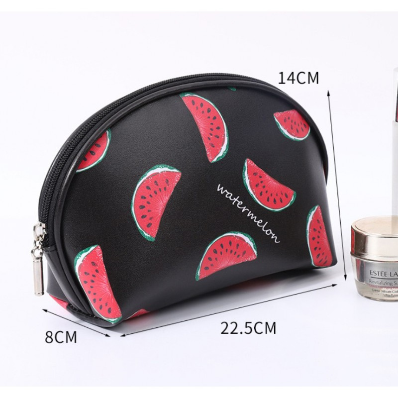 Piękna, damska rozkładana kosmetyczka, dostępna w kolorze czarnym z arbuzami Wykonana z miękkiego, śliskiego materiału.