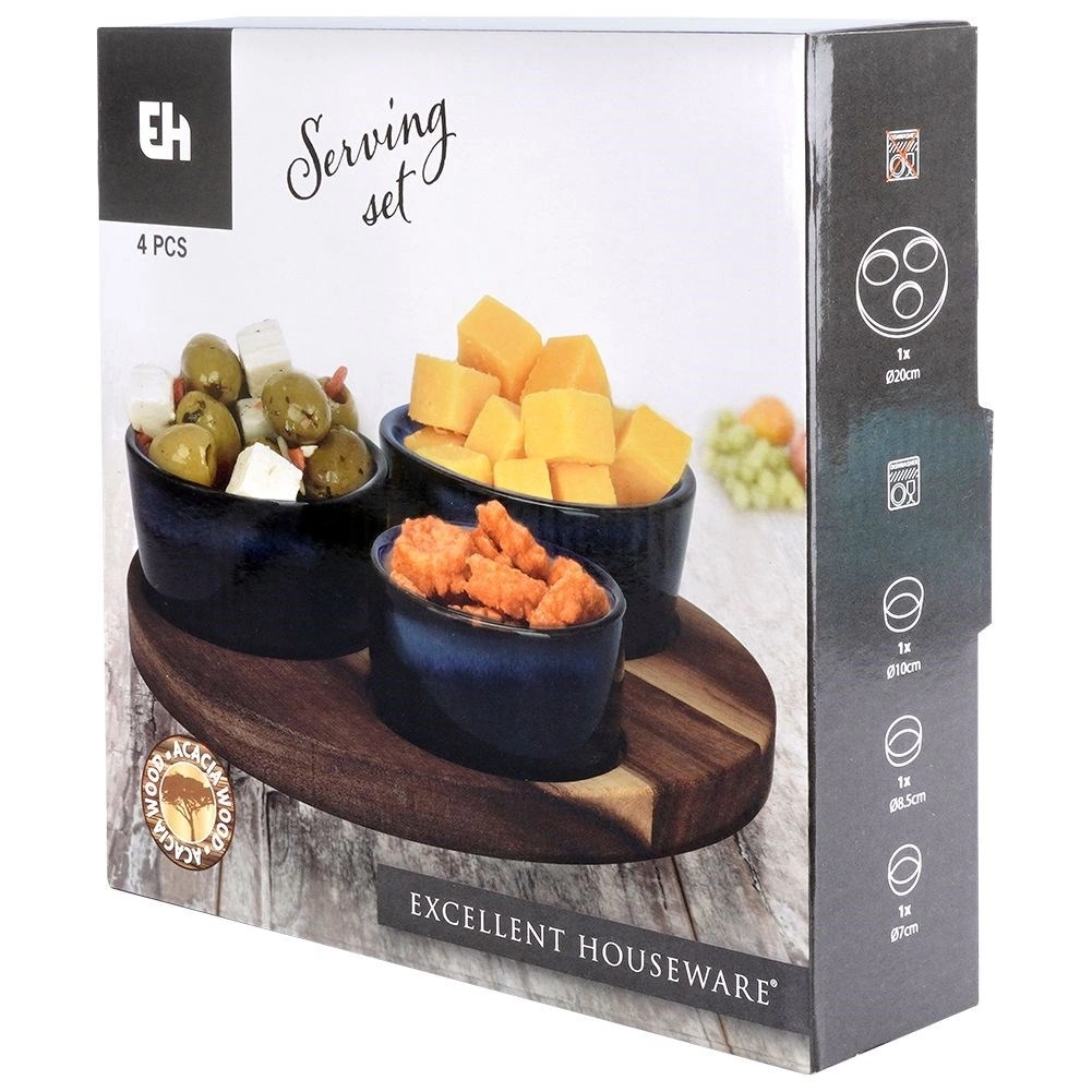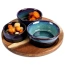 Zestaw trzech miseczek na drewnianej tacy. Wykorzystamy je do serwowania przekąsek, przystawek, sosów i dipów. Zestaw pięknie prezentuje się na stole. Serwowane sosy lub przekąski są umieszczone w jednym miejscu, dzięki czemu wygodnie je przeniesiemy. Sprawdzi się do użytku domowego oraz profesjonalnego. Wyprodukowano zgodnie z europejskimi standardami.