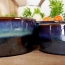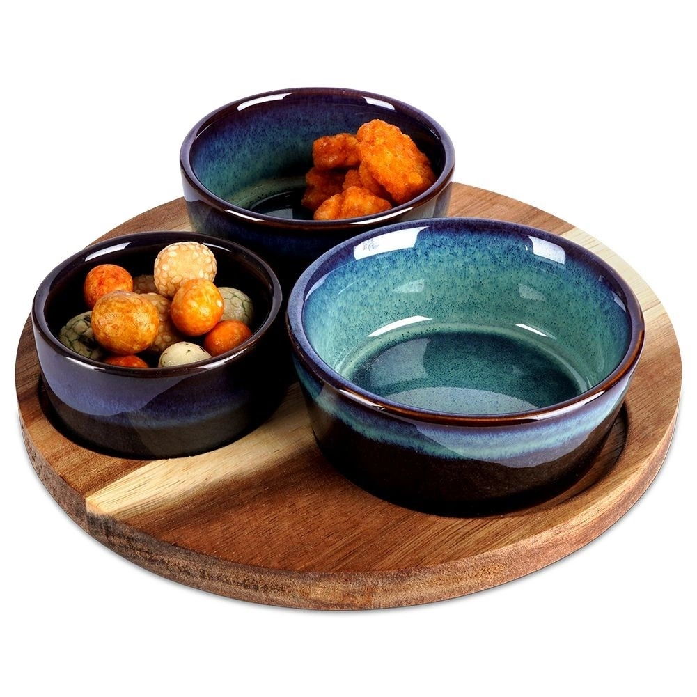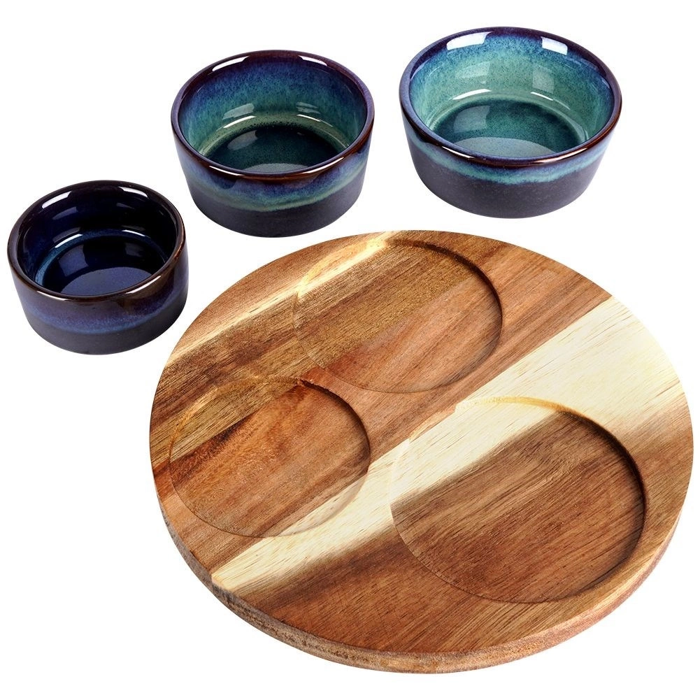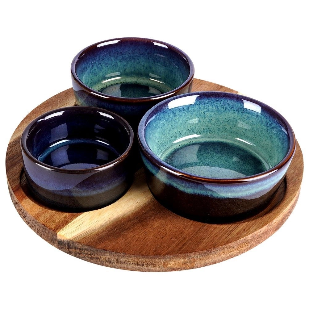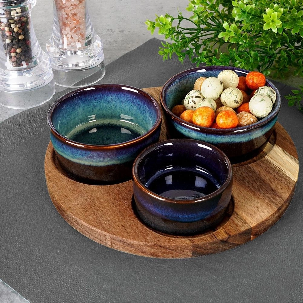 - CERAMICZNE - Zestaw trzech miseczek wykonanych z ceramiki w brązowo turkusowym kolorze, usadowionych na okrągłej tacy z drewna akacjowego. Połączenie minimalizmu z nowoczesnym designem. Wymiar zewnętrzny wynosi 20 x 20 x 5 cm. Miseczki w zestawie występują w trzech rozmiarach: mała (7 x 3 cm, pojemność 60 ml), średnia ( 8,5 x 4 cm, pojemność 140 ml), duża (10 x 4 cm, pojemność 150 ml).