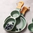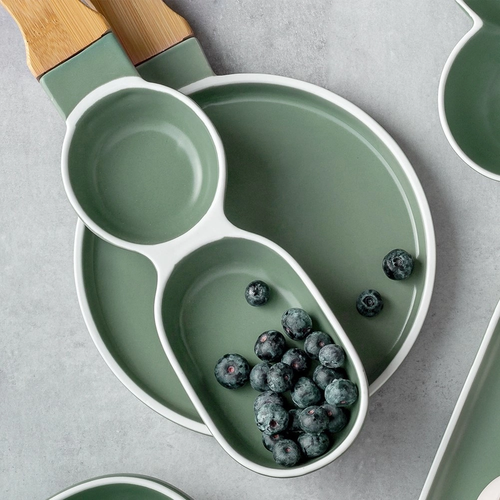 - WYTRZYMAŁY - Talerz wykonany z wysokiej jakości porcelany w zielonym kolorze, posiada biały rant. Wyposażony w uchwyt wykonany z drewna bambusowego. Talerz jest wytrzymały i solidny.