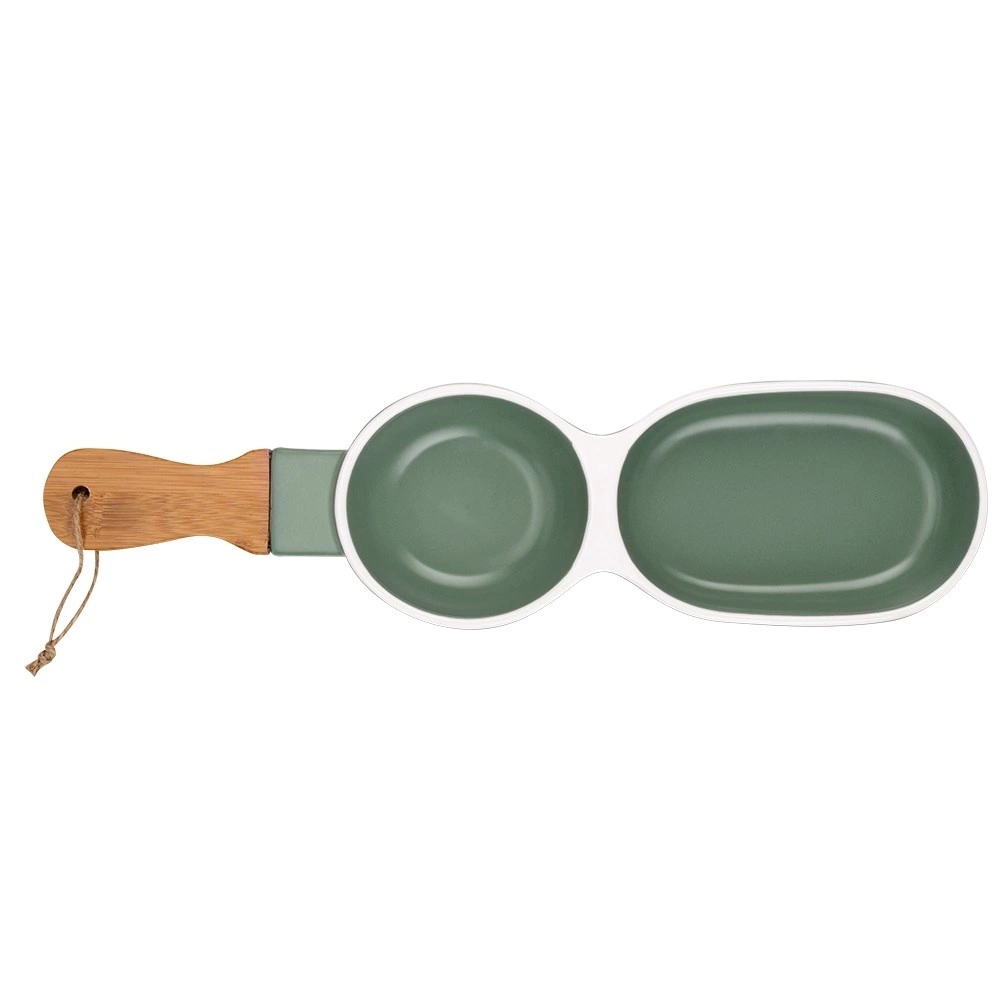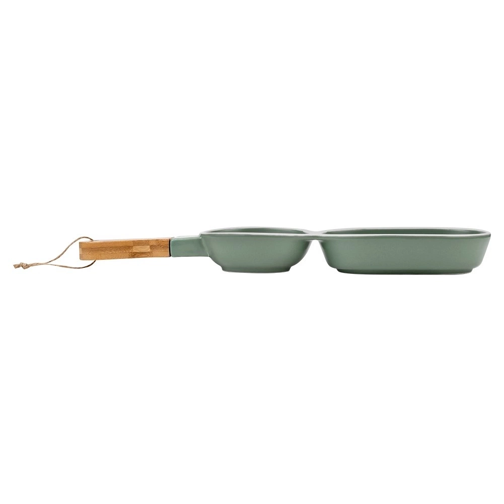 Porcelanowy talerz na przekąski z bambusowym uchwytem. Sprawdzi się do efektownego podawania słonych przekąsek, słodyczy lub dipów. Solidnie wykonany w modnej kolorystyce. Taka forma podania przekąsek jest bardzo efektowna. Dzielona powierzchnia pozwoli na odpowiednie oddzielenie przekąsek by nie mieszały się smaki. Talerz ma uniwersalny wygląd, pasuje do wielu okazji. Sprawdzi się do użytku domowego oraz profesjonalnego np. w lokalach gastronomicznych. W celu odpowiedniej konserwacji nie zaleca się mycia w zmywarce do naczyń. Oryginalny produkt greckiej marki NAVA z linii naczyń stołowych Terrestrial. Wyprodukowano zgodnie z europejskimi standardami.