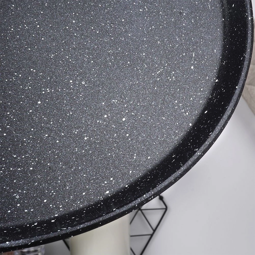 - PRZYDATNA - Płaska patelnia z powłoką granitową o średnicy 26 cm. Doskonała do smażenia naleśników oraz placków. Wymiary zewnętrzne: długość 46 cm, wysokość patelni 1,5 cm, wysokość z rączką 6 cm. Patelnia z linii Black&Wood.