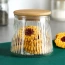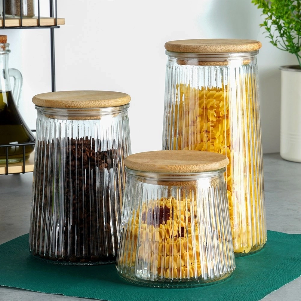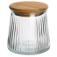 - SOLIDNY - Pojemnik wykonany z grubego szkła, które posiada ryflowaną powierzchnię, dzięki czemu prezentuje się niezwykle efektownie. Pokrywka wykonana z drewna bambusowego. Przezroczyste szkło pozwoli nam w łatwy sposób sprawdzić zawartość pojemnika.
