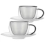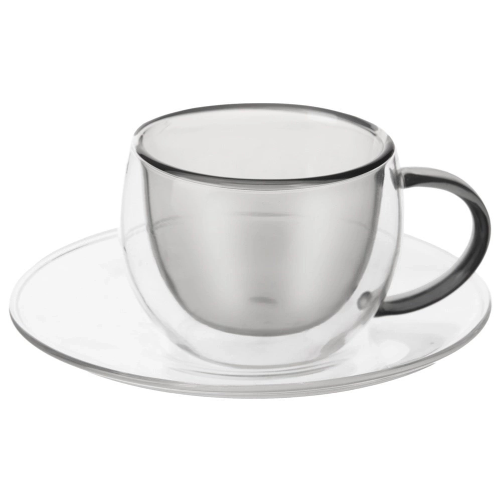- TERMICZNE - Zestaw dwóch filiżanek termicznych z podwójną ścianką w nowoczesnym designie wraz ze spodkami. Każda filiżanka ma wymiary 9 x 6,5 x 5,5 cm i pojemność 90 ml. Spodki mają średnicę 12 cm.