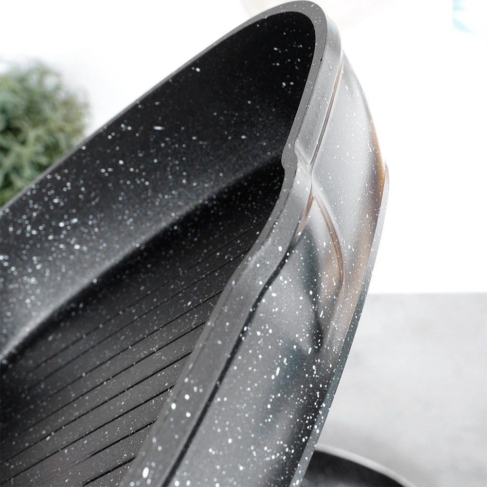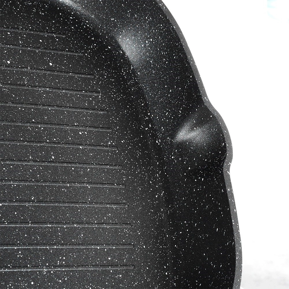 - Kwadratowa patelnia grillowa - Patelnia do grillowania z powłoką granitową o wymiarach 28 x 28 cm, posiada także dwie wylewki, które ułatwią nakładanie przygotowanych potraw. Wymiary zewnętrzne: długość 47 cm, wysokość patelni 4,5 cm, wysokość z rączką 5 cm. Wykonana z odlewu aluminium. Patelnia jest w kolorze czarnym. Karbowane dno idealnie sprawdzi się do grillowania.