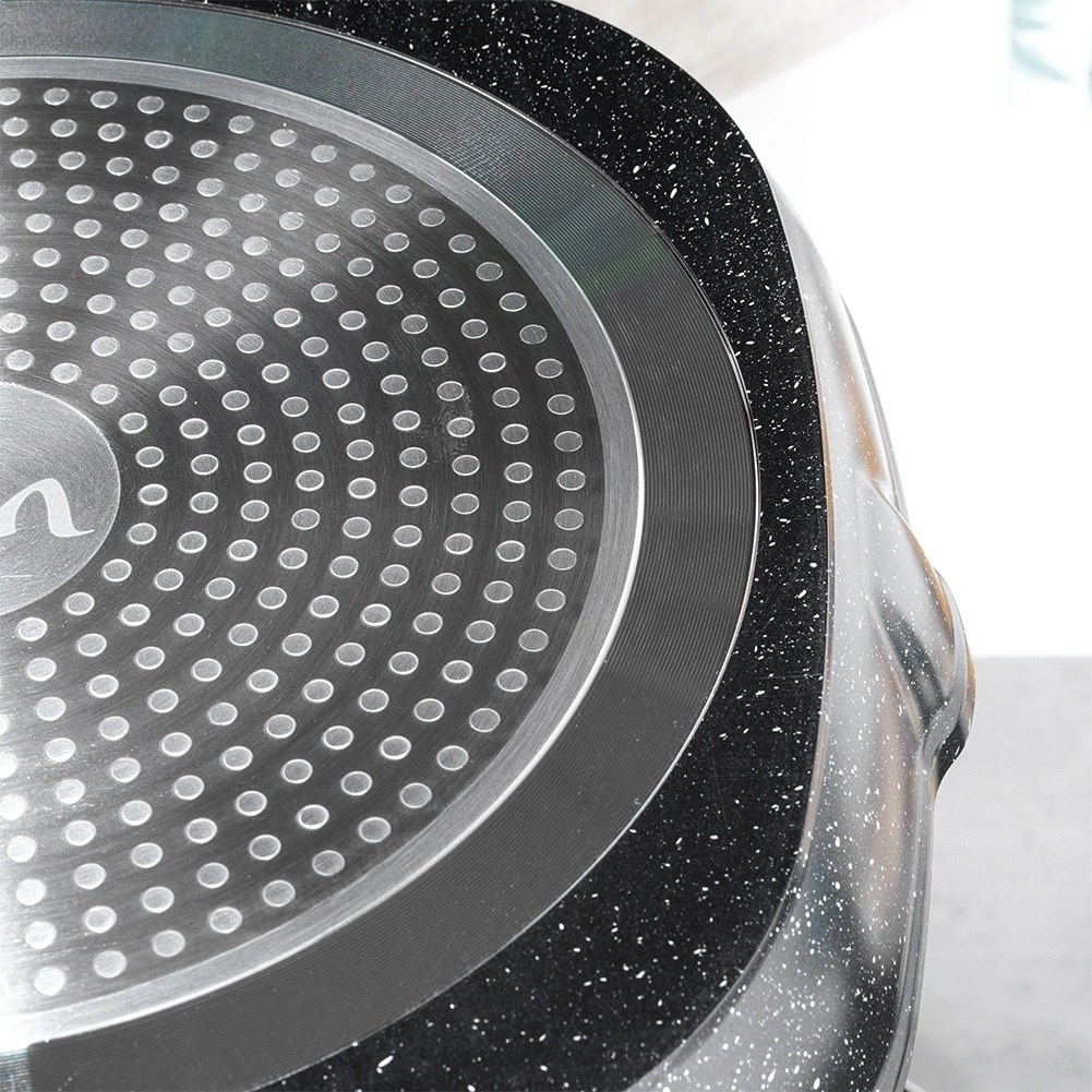 - Nieprzywierająca powłoka granitowa - Patelnia wykonana z aluminium z nieprzywierającą powłoką granitową w czarnym kolorze. Powierzchnia nieprzywierająca umożliwia przygotowywanie zdrowych i smacznych posiłków z minimalną ilością tłuszczu. Wyposażona w uchwyt wykonany z najwyższej jakości, wytrzymałego tworzywa imitującego drewno.