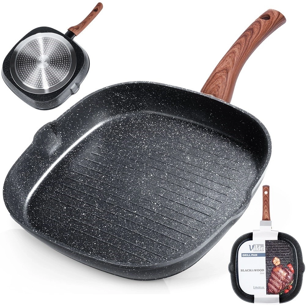 Kwadratowa, nieprzywierająca patelnia grillowa o wyjątkowym, ponadczasowym wyglądzie. Patelnia utrzymana w modnym połączeniu czerni z drewnem, dzięki czemu efektownie prezentuje się w kuchni. Patelnia jest niezbędna w każdej kuchni. Wykonana z najwyższej jakości materiałów. Odpowiednio użytkowana posłuży długie lata. Oryginalny produkt marki Vilde z linii Black&Wood. Wyprodukowano zgodnie z europejskimi standardami.