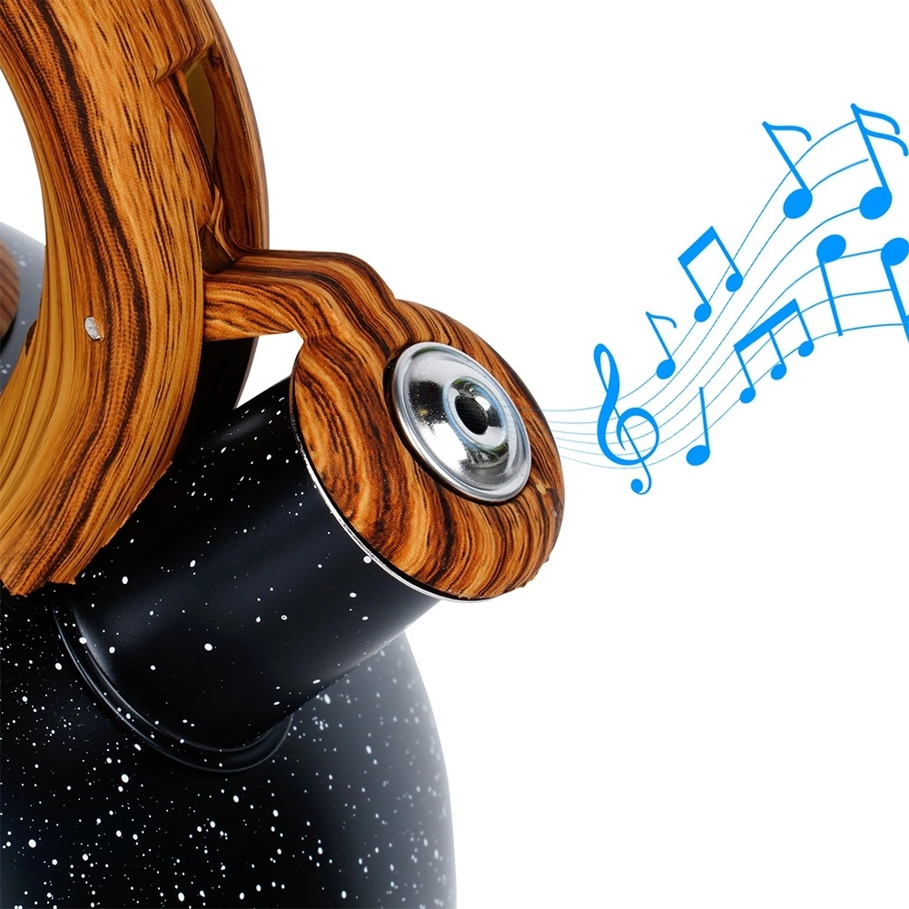 - Automatyczny gwiazdek - Czajnik posiada automatycznie otwierany gwizdek za pomocą przycisku w rączce, co pozwoli na komfortowe użytkowanie. Sygnalizacja zagotowania wody gwizdkiem. Dzięki niemu sprawnie i bezpiecznie nalejemy wrzątek do kubka, filiżanki lub dzbanka.