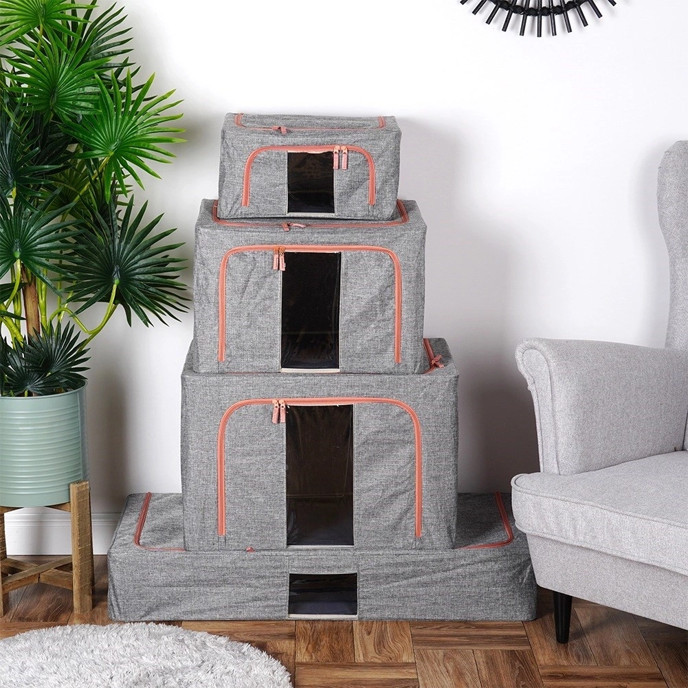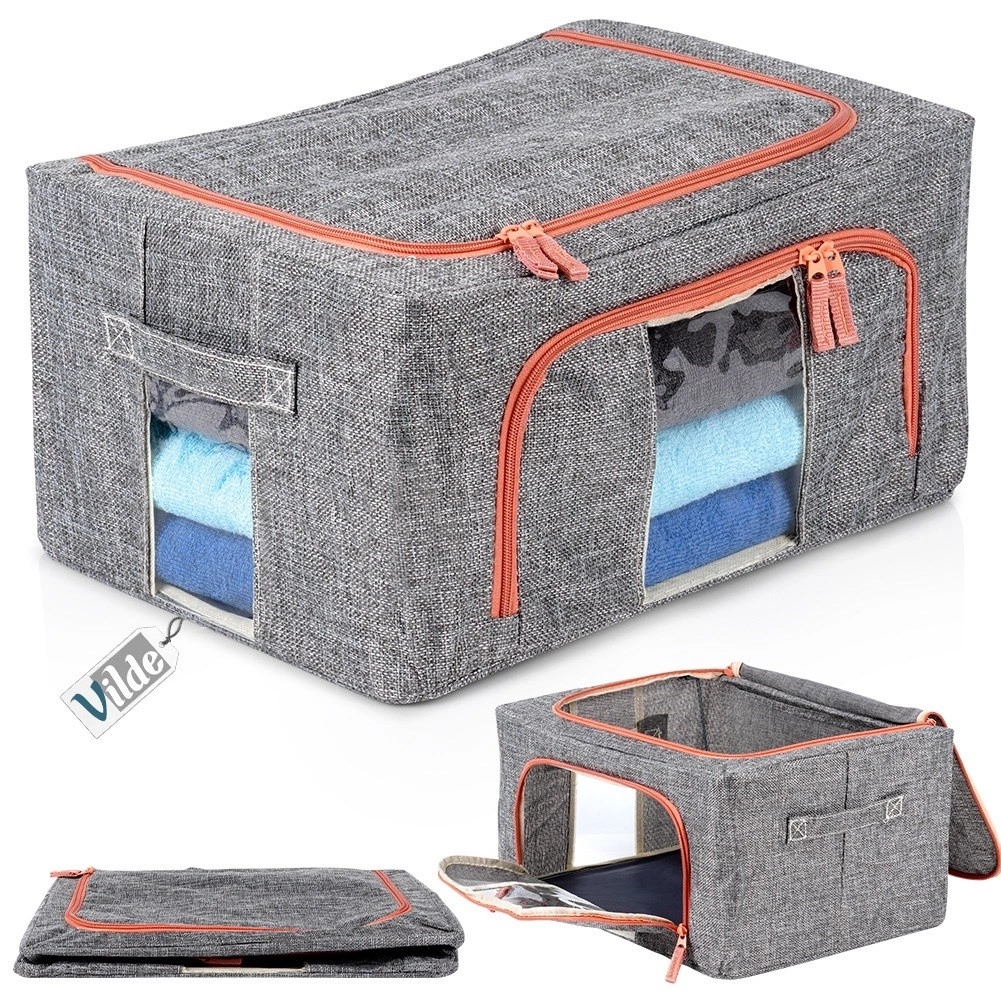 • Transparentne okienka i metalowy stelaż - Pokrowiec posiada przezroczyste okienka, umożliwiające szybki podgląd zawartości bez konieczności otwierania, co ułatwia organizację i przechowywanie. Wnętrze pokrowca posiada metalowe stelaże, które nadają mu stabilny kształt, zapobiegając zapadaniu się i ułatwiając przechowywanie ubrań oraz pościeli w estetyczny i uporządkowany sposób. Możliwość złożenia na płasko.