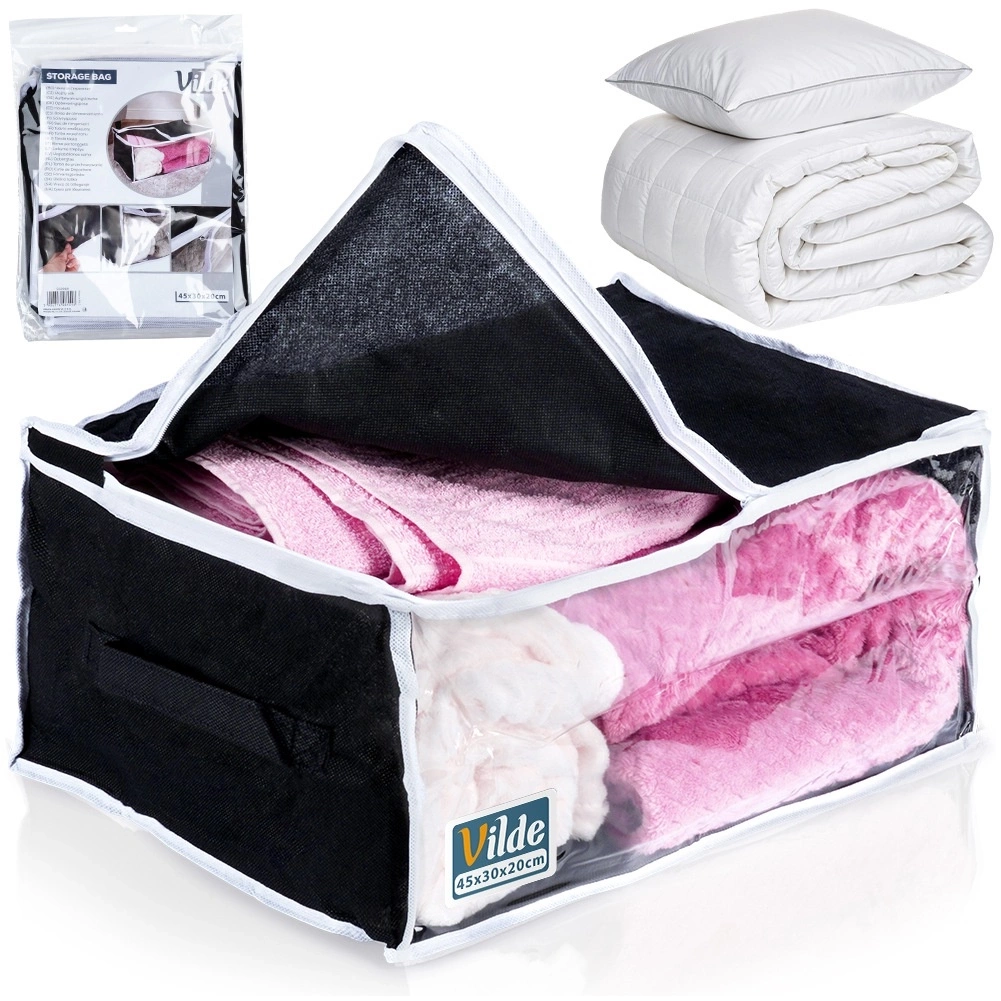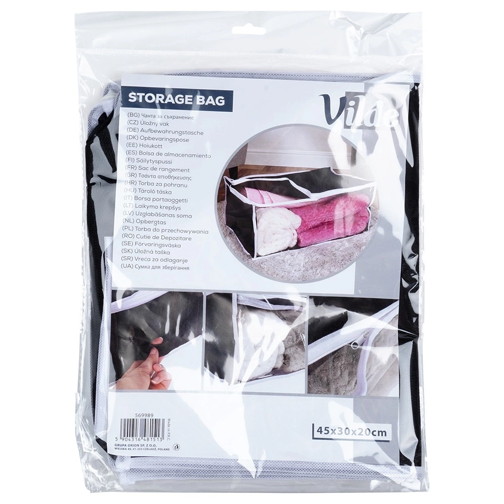Przydatny pokrowiec na pościel. Wykonany z wytrzymałych materiałów. Sprawdzi się do przechowywania koców, poduszek, ale również ubrań i innych tekstyliów. Pokrowiec jest zamykany, więc ochroni przechowywane rzeczy przed zawilgoceniem oraz molami. Z jego pomocą możemy odpowiednio wygospodarować przestrzeń w szafie lub pod łóżkiem. Oryginalny produkt marki Vilde. Wyprodukowano zgodnie z europejskimi standardami.