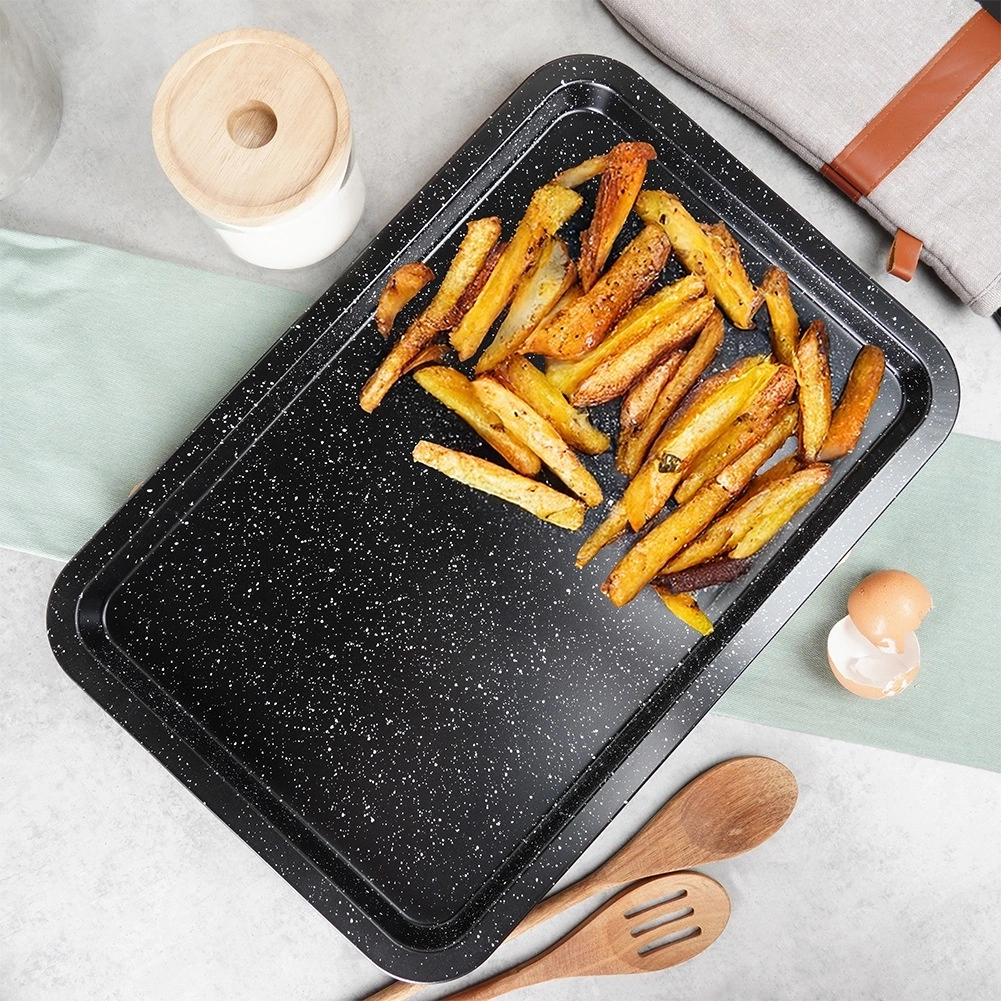 Blacha do pieczenia z powłoką granitową, znajdzie szerokie zastosowanie w kuchni. Łatwa w czyszczeniu i wygodna w użytkowaniu. Idealna do pieczenia słodkich i słonych potraw. Wykonana z najwyższej jakości materiałów, co zapewni komfort użytkowania. Oryginalny produkt marki Vilde. Wyprodukowano zgodnie z europejskimi standardami.