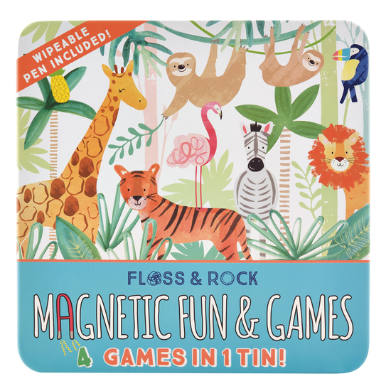 Zestaw czterech popularnych gier i zabaw magnetycznych łączy w sobie rozrywkę dla młodszych i starszych, doskonałą do wspólnej zabawy z rodziną i przyjaciółmi. W zestawie znajduje się gra, w której wspinając się po drabinach, gracze mogą znaleźć owoce, albo wpaść na węża i spaść na dół. Zawiera również grę opartą na zasadach kółka i krzyżyka. Dla małych miłośników logicznych wyzwań przygotowano planszę do zabawy w wyszukiwanie słów. Ponadto planszę magnetyczną zapewniającą kreatywną zabawę w poznawaniu i odkrywaniu dzikich zwierząt oraz wspanialej roślinności dżungli.