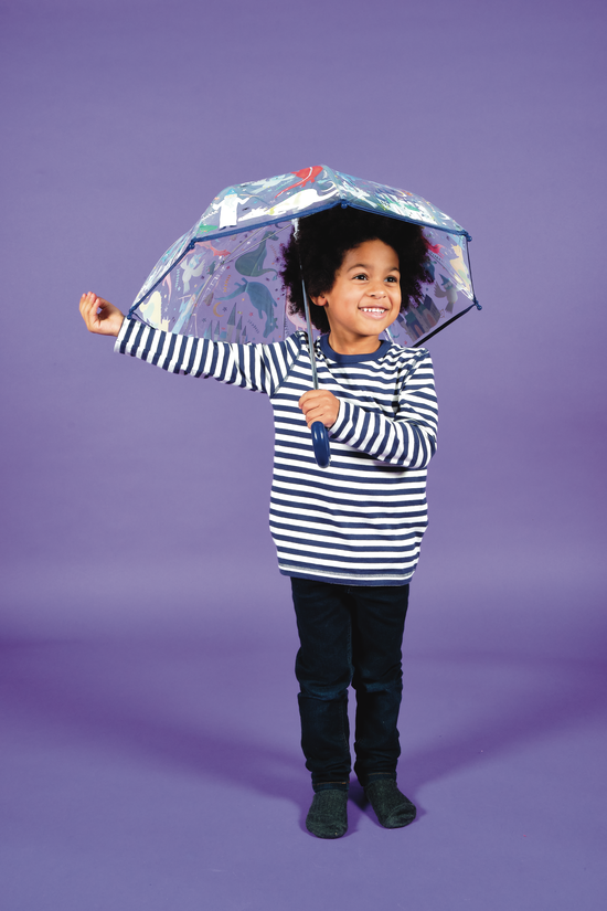 Zapewnij swojemu dziecku niezapomniane przygody podczas spacerów w deszczu dzięki magicznej parasolce zmieniającej kolory! Za każdym razem, gdy deszcz zaczyna padać, białe kształty na parasolce magicznie wypełniają się kolorowymi motywami czarodziejskiego zamku, rozweselając nawet najbardziej pochmurny dzień. Gdy parasolka wysycha, kolory wracają do bieli. W komplecie znajduje się wygodne zapięcie na rzep, które zabezpiecza złożoną parasolkę.