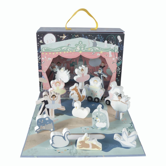 Zapraszamy na wspaniałą scenę teatralną, gdzie świetna zabawa czeka na każdego! Ten zestaw składa się z 15 fantastycznych, dwustronnych drewnianych figurek oraz rozkładanej planszy do zabawy, przedstawiającej piękną scenę teatralną i jezioro z zaklętymi łabędziami. W tym uroczym świecie znajdziesz baleriny, tancerzy, łabędzie w filiżankach, zwierzaki na kółkach i wiele innych bajkowych postaci. Ciesz się godzinami zabawy zarówno samodzielnie, jak i w towarzystwie przyjaciół i rodzeństwa. Po zakończonej zabawie włóż drewniane figurki i pozostałe elementy do poręcznego woreczka ze sznurkiem, zamknij pudełko, a następnie skorzystaj z wygodnego uchwytu do przenoszenia, aby zabrać zestaw na kolejną przygodę.